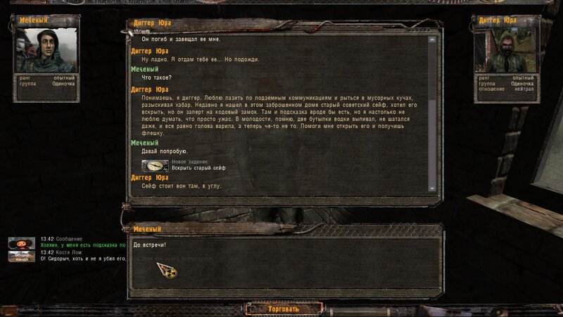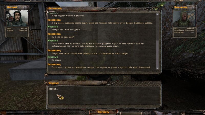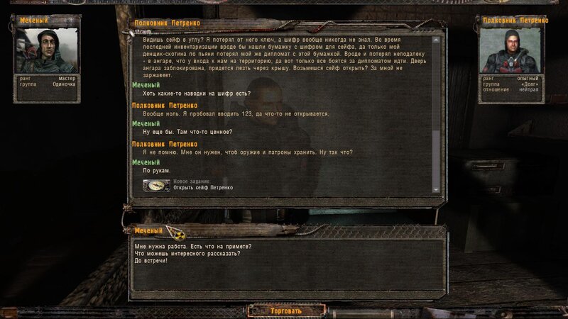 Z Pietrenko mówimy o Odnogłazym - był i robił zakupy - poszedł na Magazyny lub Wysypisko. Bierzemy też zadanie na otwarcie sejfu - podpowiedzi znajdziemy w pomieszczeniu z zblokowanymi drzwiami - mamy tam wejść przez dach. Kiedy wychodzimy dostajemy SMS i mówimy na uboczu z Nieznakomcem. Odnogłaza mamy znaleźć przy wejściu na Magazyny wojskowe.