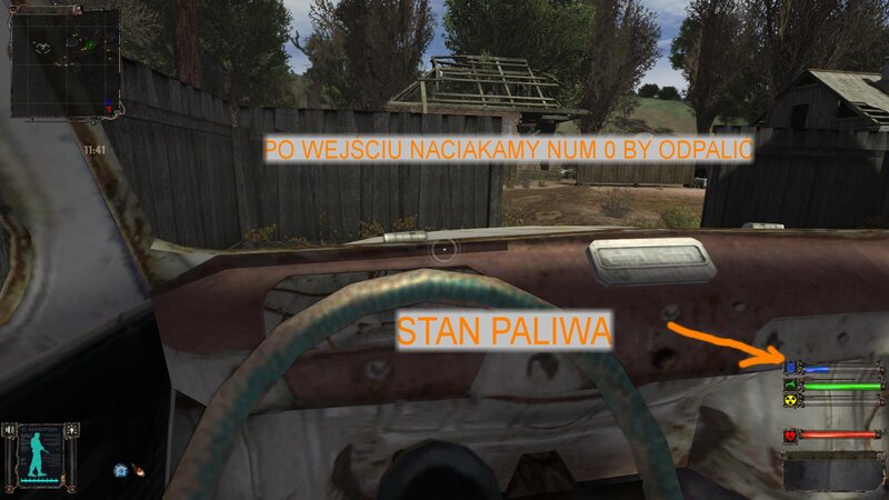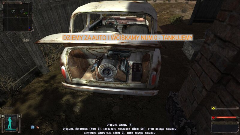 Teraz czas na wycieczkę samochodem. Kanister już mamy. Zachodzimy za samochód i wciskamy 0 w klawiaturze numerycznej - zatankowaliśmy. Zabieramy od Wołka skrzynie z artami i wsiadamy “F” do samochodu. Silnik zapalamy 0 w NumLock. Na miejscu oddajemy skrzynie wojskowemu - nasza z bronią jest już w bagażniku. Kiedy jedziemy autem koło Wołka dostajemy SMS - wysiadamy i mówimy z Wołkiem. Nagrodę odbieramy od Sidorowicza. Zrobiłem też zadanie dla handlarza na Meduzę i wziąłem na poszukiwanie gitary w Wiosce Kotów.