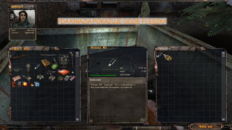 Fleszkę dostaniemy od Waśki Podajpatrona na Wysypisku. Ten za pomoc chce byśmy wyciągnęli artefakt z dziwnej anomalii. Pomaga nam Czeburaszka - mamy przez cztery teleporty dostać się do artu - portale są wkoło nas na tle Pchlego Targu.