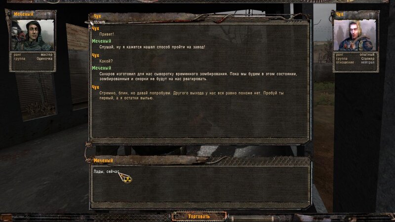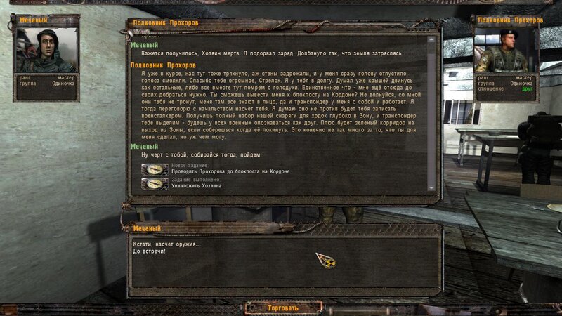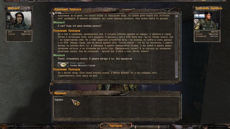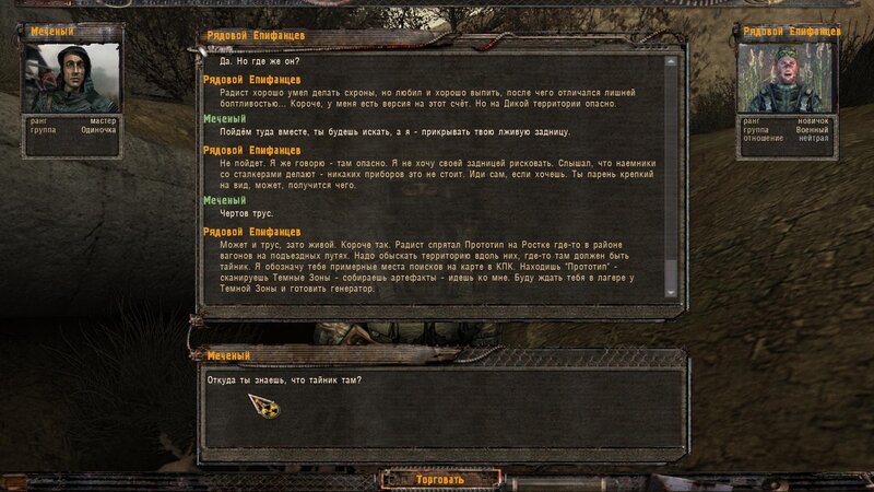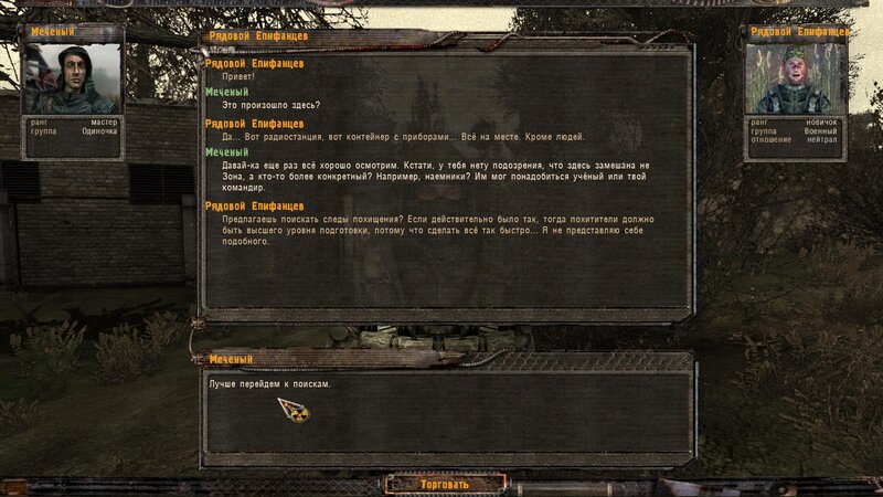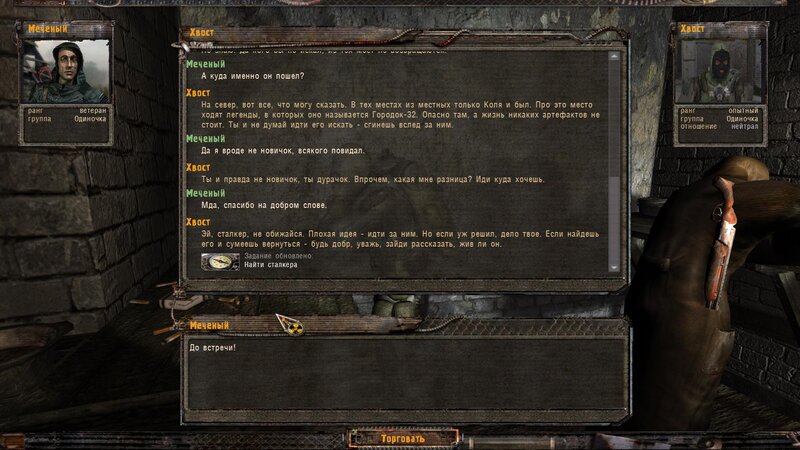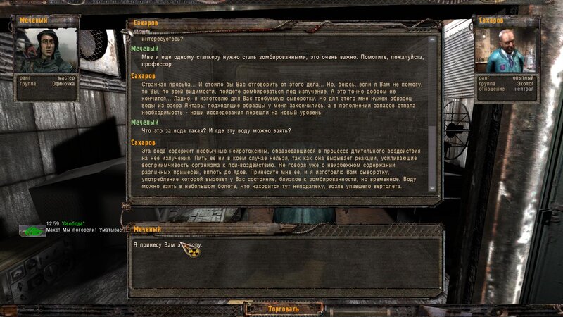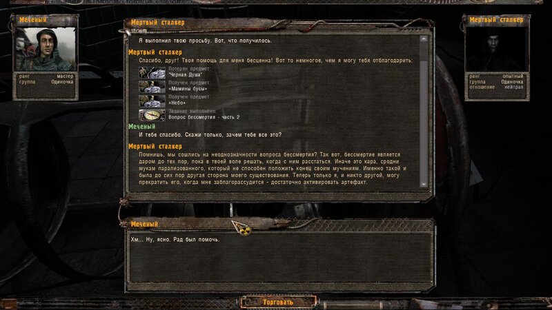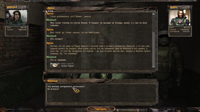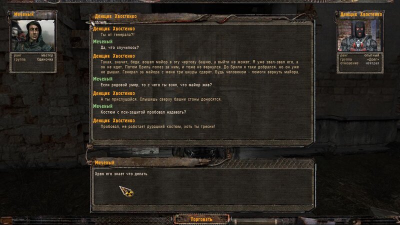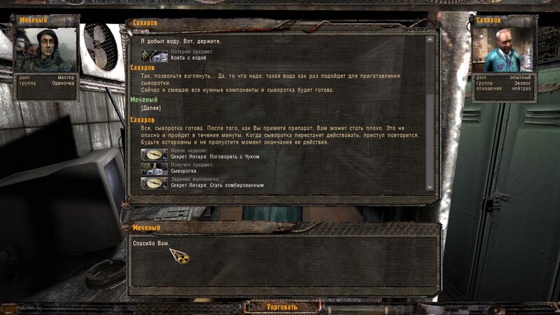 Zabity mówił coś o prototypie który może obsługiwać Radist - sobowtór. Riadowoj Enifiencew tłumaczy nam wszytsko pokrętnie. Musimy znaleźć schowek Riadista na dziczy - może być w trzech różnych lokalizacjach. Od Sacharowa dostajemy żyworódkę - mamy ja wypić z Czukiem - zombi nas nie będą widzieć.