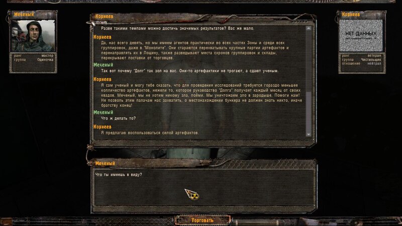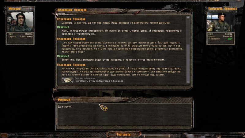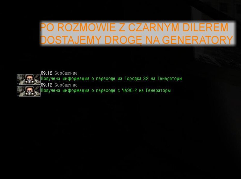 Po szturmie sarkofagu i przejściu przez teleporty dostajemy drogę na CEZAS 1 i z powrotem. Przychodzi wiadomość - mamy pomówić z Czarnym Dilerem. Dowiadujemy się, że Striełok to my - mamy poszukać pomocy u Powinności, Wolności i Wojska w zniszczeniu Świadomości na Generatorach. Dostajemy też przejście z Miasteczka 32 na Generatory.
