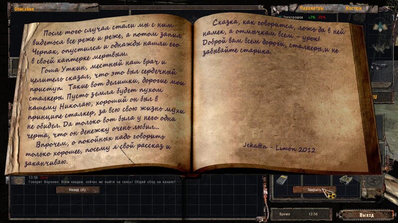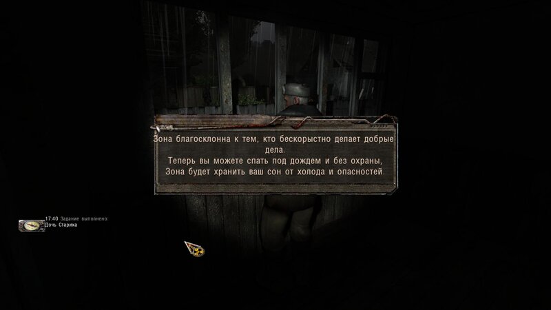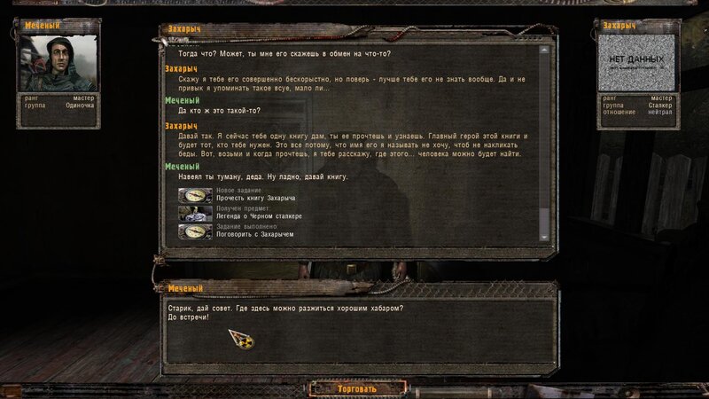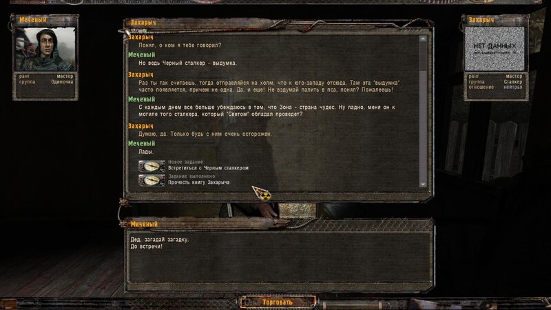 Dziadka Zacharycza znajdujemy w domku trochę dalej od zabudowań - opowiada nam legendy i daje książkę do przeczytania. Musimy odnaleźć Czarnego Stalkera i zdobyć art który będzie nas chronił w Śmierć -zonie.