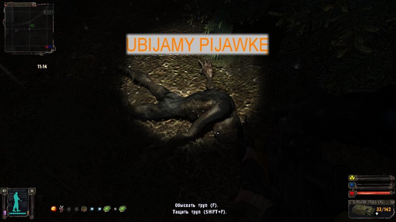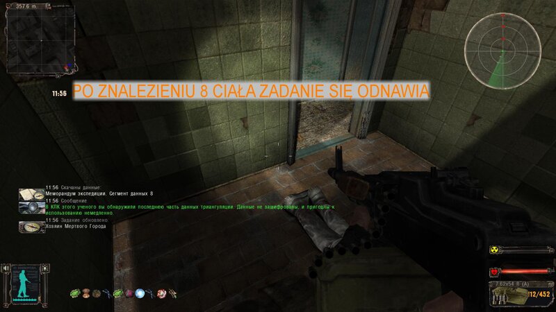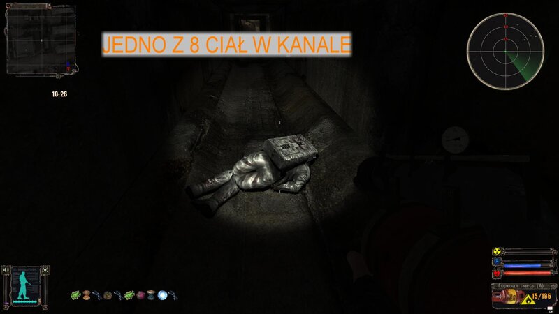 Po wejściu do Miasta dostajemy wiadomość od Czeburaszki, że w pobliżu jest ciało Koli. Na mapie odznacza się gdzie mamy szukać. Dostajemy też SMS od tutejszego barmana. Mówimy z nim i z pułkownikiem Prochorowem - mamy odnaleźć ciała 9 naukowców i pobrać z ich PDA dane. Najpierw odnalazłem ciało Koli - strzeże go kontroler i stado zombich. Czeburaszka zabiera nam artefakt znaleziony przy ciele przyjaciela. Odnalazłem 7 ciał naukowców - są rozrzucone po całym mieście - widać kropki ciał. Jeden jest w podziemnych tunelach. Odblokowałem też klondajk artefaktów - nieźle się obłowiłem.