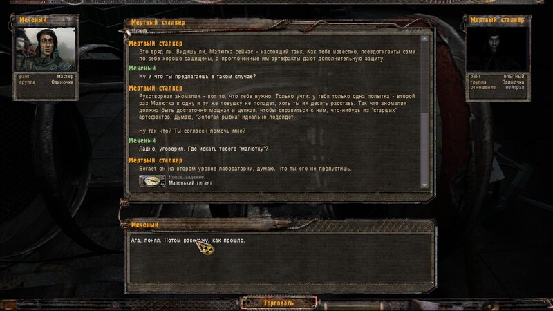 Nieumarły ma dla nas jeszcze jedno zadanie - zabić małego Pseudo-giganta. Pozostał on sam po śmierci matki i nie daje spokoju. Mamy go zagnać do anomalii za pomocą Złotej Rybki. Najpierw trzeba zdobyć art.