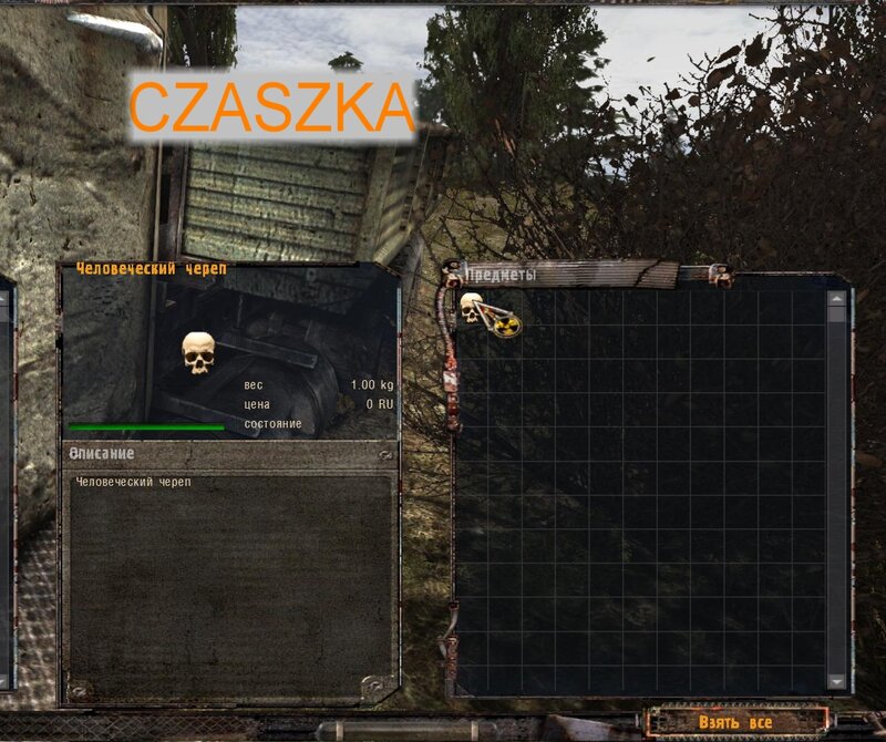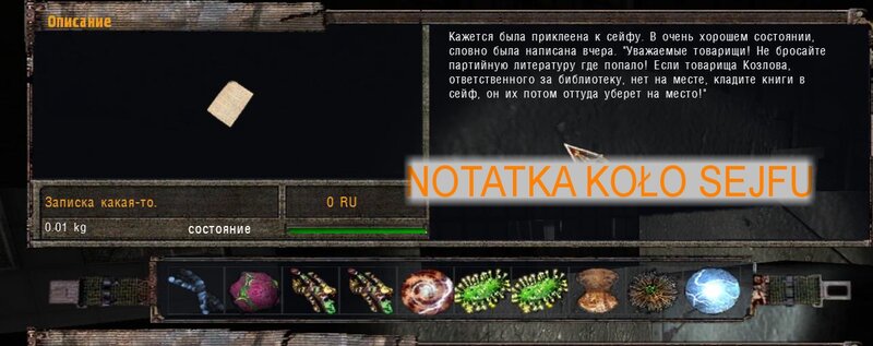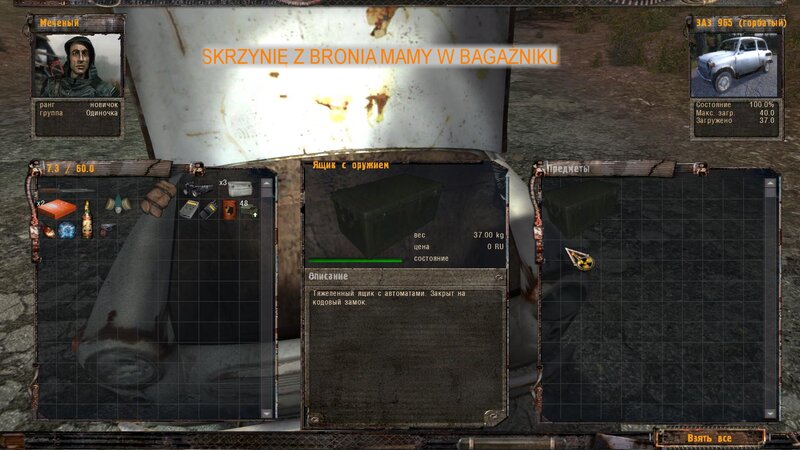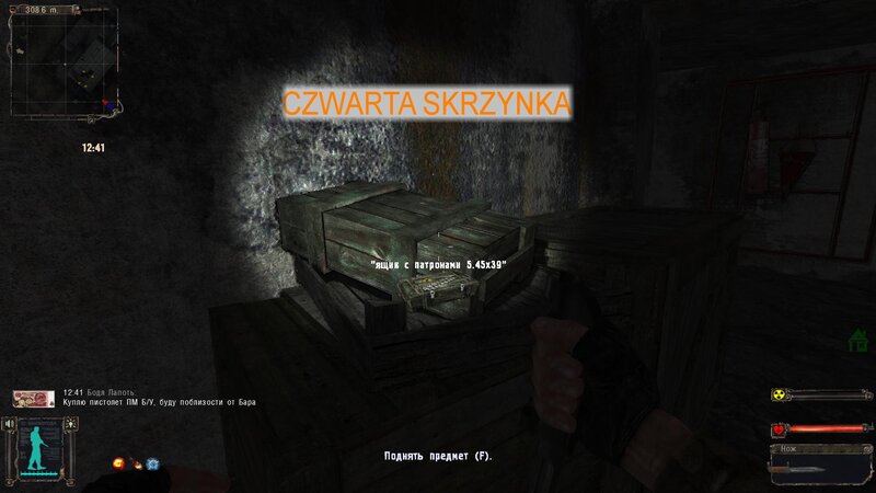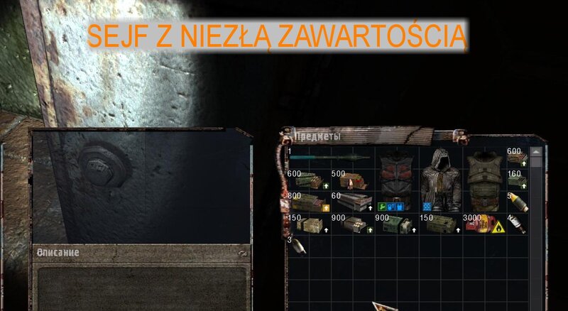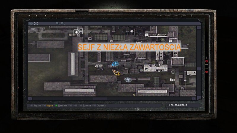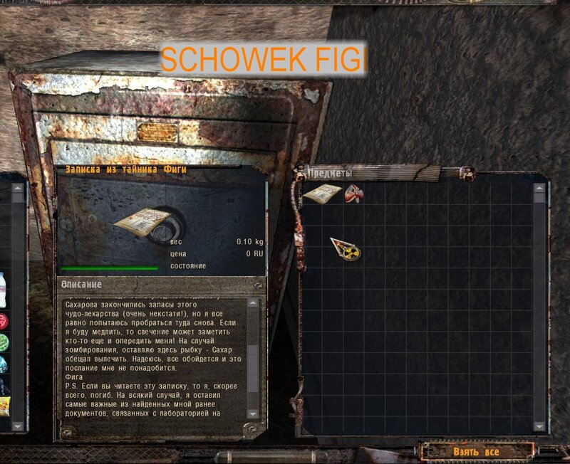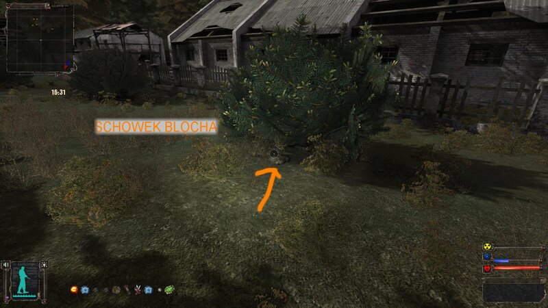 NAJPIERW POWINNIŚMY PÓJŚĆ DO DOLINY - W ZAMIAN DOSTANIEMY PSI HEŁM. Mnie się nie chciało i waliłem na zakład na pateczkach. Wypiłem miksturę i poszedłem z Czukiem do zakładu. Figę znajdziemy na ziemi w hangarze zaraz za brama po lewej. Dostajemy od niego namiar na schowek - to wielki sejf na terenie baru pośród anomalii - taki jest koło wierzy za siatką. Aby nie być już zombim idziemy do Sacharowa - za złotą rybkę nas leczy. Odnajdujemy sejf.