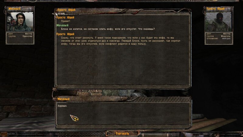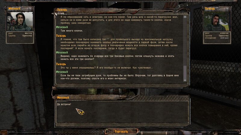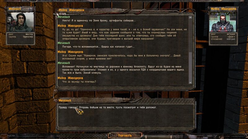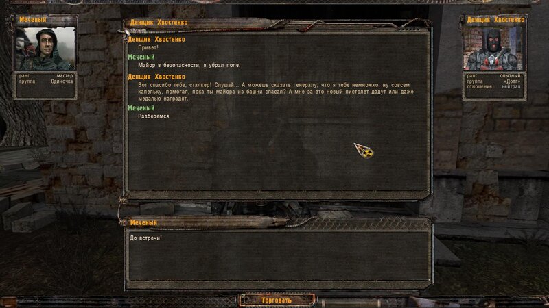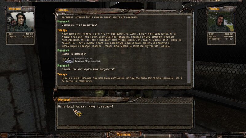 W rozmowie z Woroninem wychodzie, że Żywodierow który nas aresztował i ma nasze graty wpadł w psi pułapkę w wierzy. Najpierw mówimy z Chwostenko, później woła nas Tykar - wychodzi z bramy obok wierzy. Żywodierow chciał okraść jego schowek - w nim było też urządzenie ukradzione naukowców - najwidoczniej je uruchomić. Aby je dezaktywować trzeba zjechać mocą do zera przełącznikami po lewej i zatwierdzić dolnym. W przeżyciu ma nam pomóc bimber z Kordonu od Tolika - Tykar nam go daje.