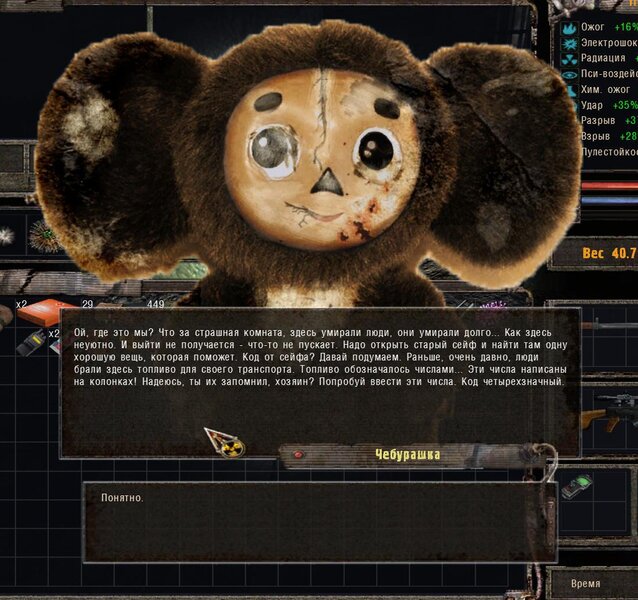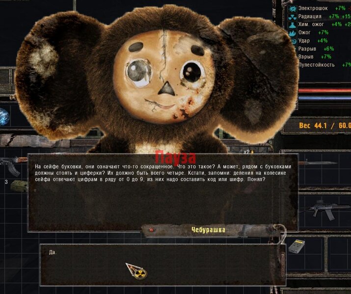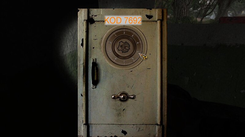 Dalej poszedłem do Diggera Jury - siedzi w domku koło Lisa. Aby uzyskać fleszkę chce od nas byśmy otworzyli sejf. Przychodzi wiadomość od Czeburaszki - ma dla nas podpowiedz - z czterech cyfr mamy zrobić kod - podpowiedzią jest napis na sejfie - OGSE - kod to 0693 - wersja moda. W środku jest książka - Digger jej nie chce - daje nam karabin do naprawy dla Papy Karła zwanego Siniakiem.
