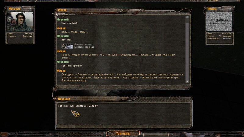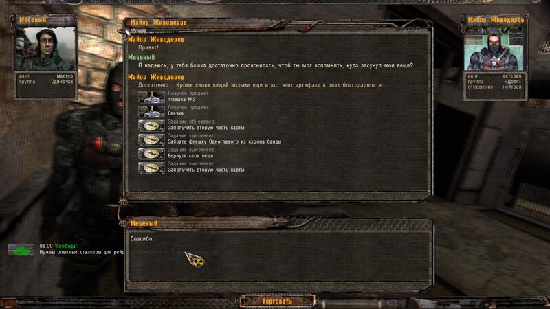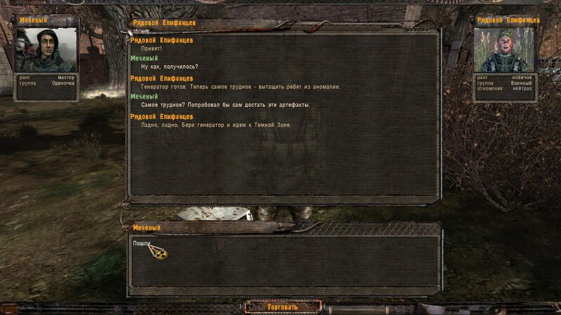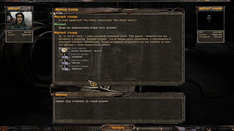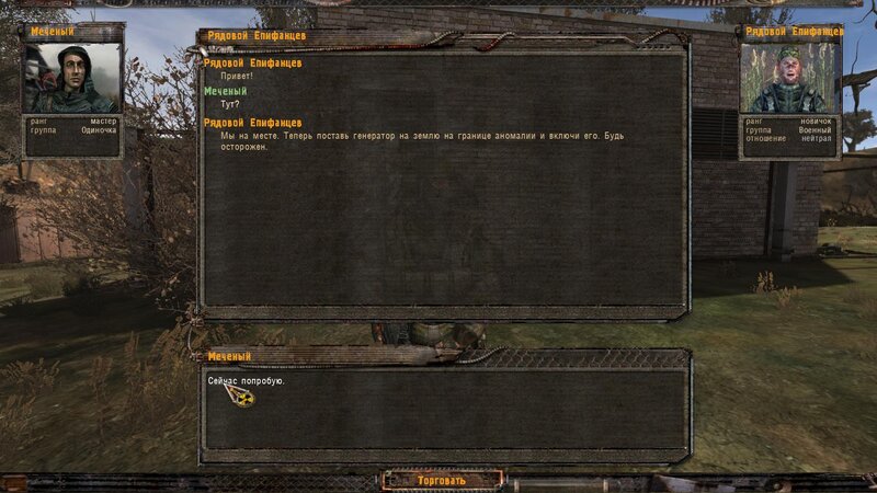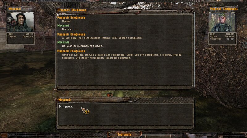 Odniosłem arty dla Riadowoja Jenifiencewa - ten włożył je do generatora. Kiedy podchodzimy do anomalii mówimy z nim i wrzucamy maszynę w sam środek. Następuje trzaski i przychodzi SMS by nie pozwolić Riadowojowi majstrować przy urządzeniu - zabijamy drania zanim zabierze artefakty ze środka. Z anomalii wychodzi zaginiona ekspedycja z uczonym. Pomówiłem z kapitanem Rogozą - okazuje się, że to Radista zabiliśmy który podszywał się pod Riadowoja. Dostajemy nagrodę za ocalenie - fleszkę i amunicję.