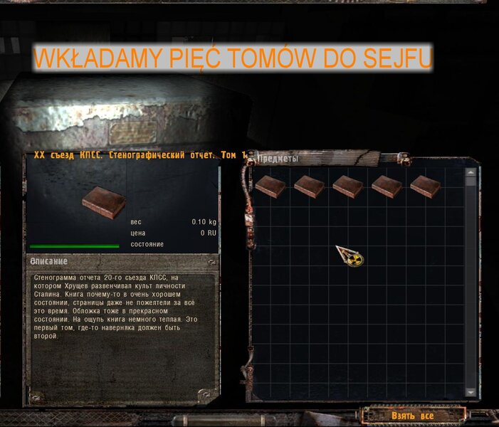 W Miasteczku oczyściłem ulice z mutantów i zombich. Po wejściu do budynku w którym mamy spotkać kuriera okazuje się, że drogę wyjściową zamyka anomalia. Na posadzce znalazłem notatkę - mamy zebrać w budynku pięć tomów klasyki i włożyć do sejfu an parterze - wtedy anomalia zniknie. Pomówiłem z Minorem. Książki są najczęściej w toaletach i dwie na posadzce w sypialniach. To dzieła Lenina. Po włożeniu tomów do sejfu następuje zdjęcie anomalii z wejścia. Minor dostaje od nas karabin i amunicję ale stoi jak kołek - zabijamy go. Przychodzi SMS że w takim wypadku mamy szukać kodu w domku gdzie kurier miał być wcześniej - czyli na Magazynach.