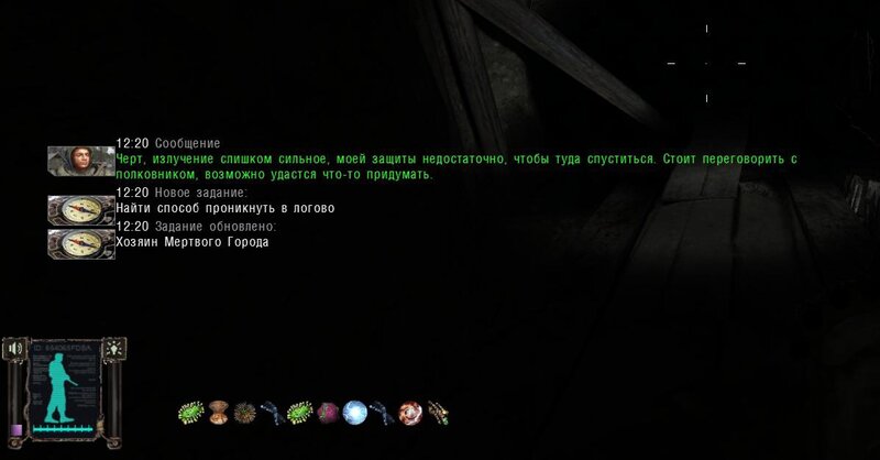 Po odnalezieniu 8 ciał pojawia się zadanie by odnaleźć przyczynę złej aury w mieście. Znalazłem wejście do zalanego peronu - niestety bez modyfikacji psi- hełmu nie mogłem tam wejść. Pomówiłem z pułkownikiem - ten dokonał modyfikacji urządzenia. Wróciłem do zalanego podziemie i pomówiłem z Chozjaninem. To jeden z naukowców. Jest złem i musimy go zniszczyć.