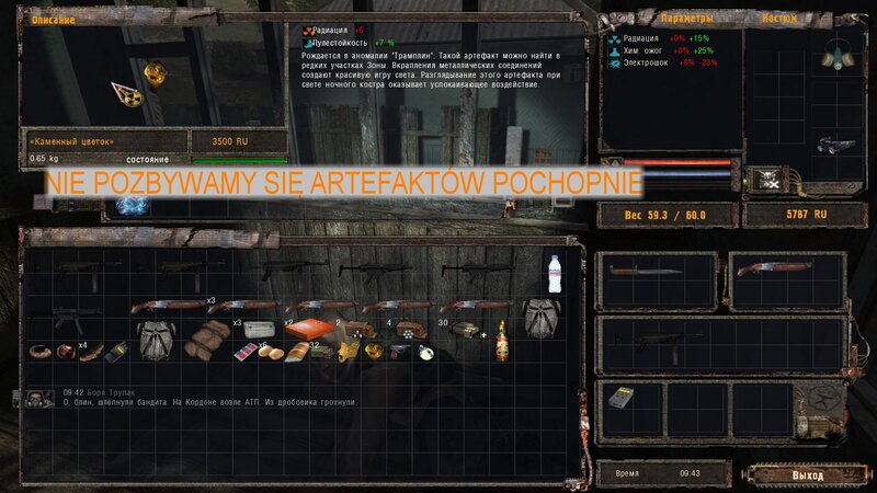 Kurtka jest tam gdzie zawsze - tylko teraz pod kręgami z betonu. Przed tunelem znalazłem artefakt Kotlet dla Lekara. Za kurtkę dostałem Kamienny Kwiatek - nie pozbywamy się go. Spacyfikowałem po wszystkim ATP- nazbierałem gratów. Za jedno z zadań dostałem REM - zestaw. Na screenie pokazałem jak korzystać.