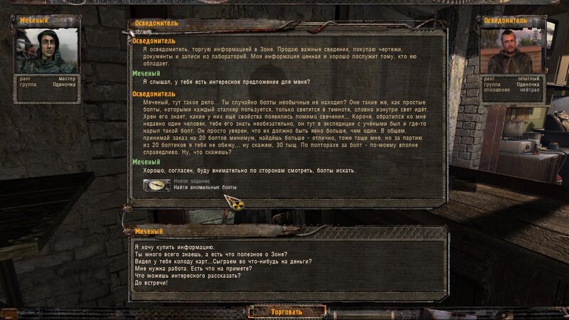 Na Kordonie śledzimy naszą przynętę - kiedy pada strzał zabijamy snajpera. Rozliczamy się z Barmanem. Koło wejścia na Dzicz kierując się w stronę przejścia na Magazyny dostałem SMS - jest tam grupa chorych - mamy znaleźć w Dolinie profesora Gorbowskowo. U Informatora w Barze możemy wziąć zadanie na poszukiwanie anomalnych śrub - walają się na lokacjach - kilka już mam. W schowkach znalazłem wykrywacz min i detektor Weles. W Barze jest przewodnik.