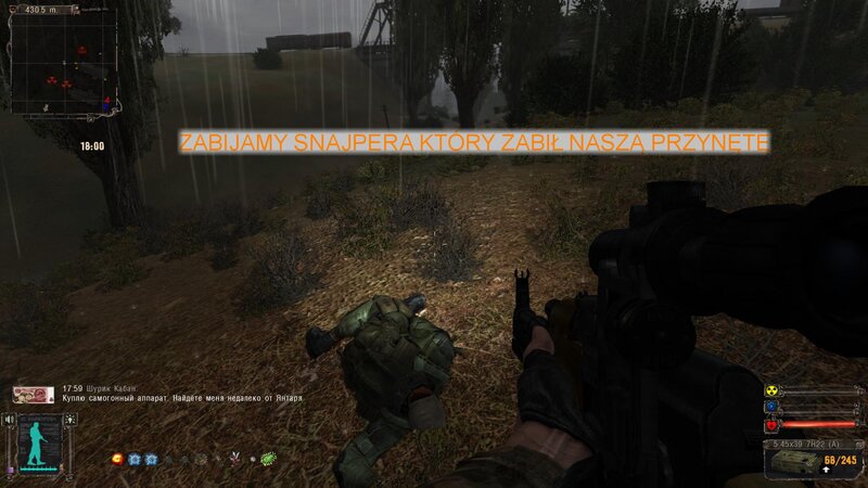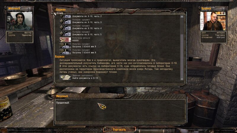 Będąc na Jantarze kupiłem sobie kamerę termowizyjną. Poszedłem do Barmana i rozliczyłem się z dokumentów w X-18. Teraz mamy zabrać się za X-16. Pomówiłem też o snajperze - mamy zabójcę odnaleźć na Kordonie i załatwić co trzeba. Po drodze na Wysypisku postrzelałem do mutantów z PKM stacjonarnego.