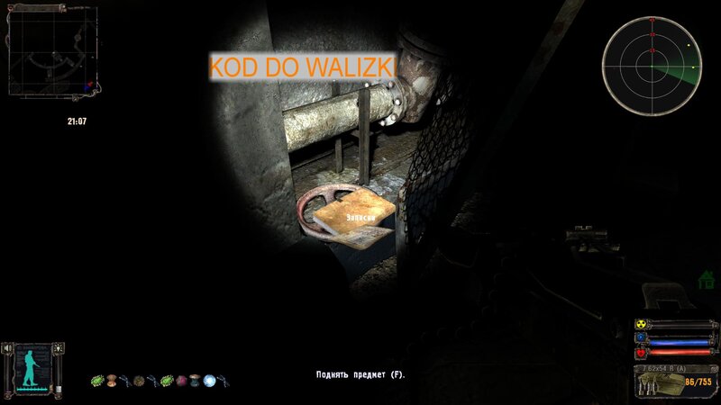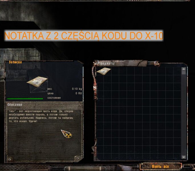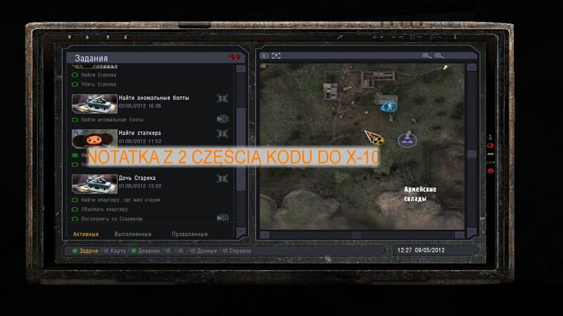 Na Magazynach Wojskowych udałem się do chutoru obok bazy - tam w domku gdzie miał być kurier, w skrzynce w piecu znalazłem notatkę z drugą częścią kodu do odblokowania wyłącznika w X-10. Na Radarze spotkałem hanlarza w baraku koło x-10 - podał nam przejście z Radaru na Jantar.. W laboratorium zabiłem wszystko co się ruszało i wbiłem kod CNFKRTHRKSR do laptopa - po tym wyłączyłem anteny.