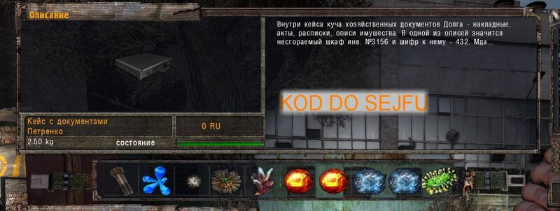 Odnalazłem przed rozmową z Woroninem aktówkę z kodem do sejfu Pietrenki. Leżała na środku tego hangaru do którego wchodzi się przez dach - uwaga są tam anomalie rozwalające kombinezon. Kod do sejfu to 432. W środku jest książka i kilka przedmiotów. Oddajemy znalezisko - książka zostaje dla nas - możemy poczytać historię. Za aktówkę też możemy zgarnąć kasę lub oddać - i tak dostaniemy nagrodę o większej wartości niż 5 tysięcy.