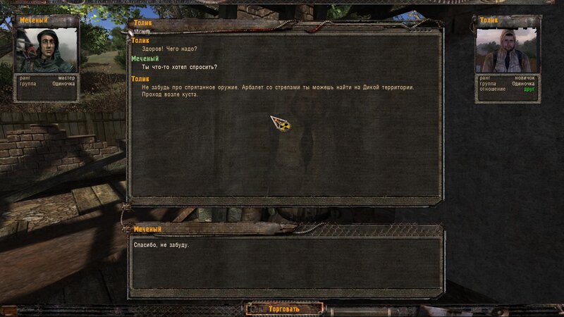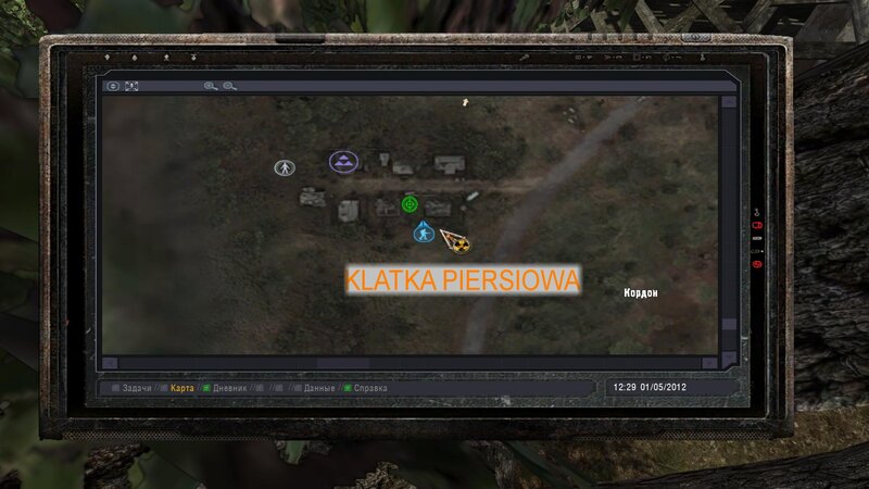Na Kordonie pomówiłem z Prochorem - dziadek stoi w chatce we wsi - mamy znaleźć jego mieszkanie w Prypeci i znaleźć jakieś wieści o jego córce. Tolik dał nam namiar na kuszę - na Dziczy wejście koło krzaka. Jest ona nam potrzebna do tego by wejść na teren Powinności. Na Dziczy znalazłem krzak - w nim teleport za siatkę. Koło ciężarówki jest wnęka i w niej kusza. Poszedłem do sierżanta Pliczko i wszedłem na teren Powinności.