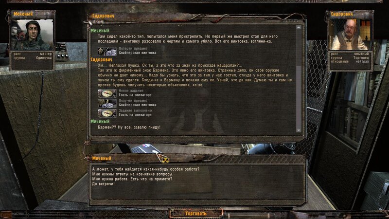 U Sidora dostałem zadanie - sprawdzić kto kręci się po Elewatorze - okazało się, że to snajper - zabieramy jego broń - na niej jest znak firmowy Barmana - mamy to z nim wyjaśnić. Zrobiłem też zadanie na teczkę z KPP.