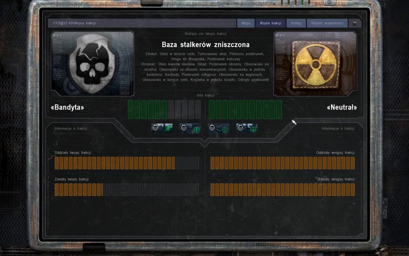 Trochę pognębiłem sobie stalkerów. Bandyci mają przechlapane, bo z każdej strony trzeba bronić posterunków przed wrogimi oddziałami. Ale jakimś cudem udało się przejąć drogi na kordonie i… Zająć bazę neutrałów. Co prawda moi upośledzeni koledzy z frakcji po chwili i tak zostali odparci, ale satysfakcja pozostała ![]()