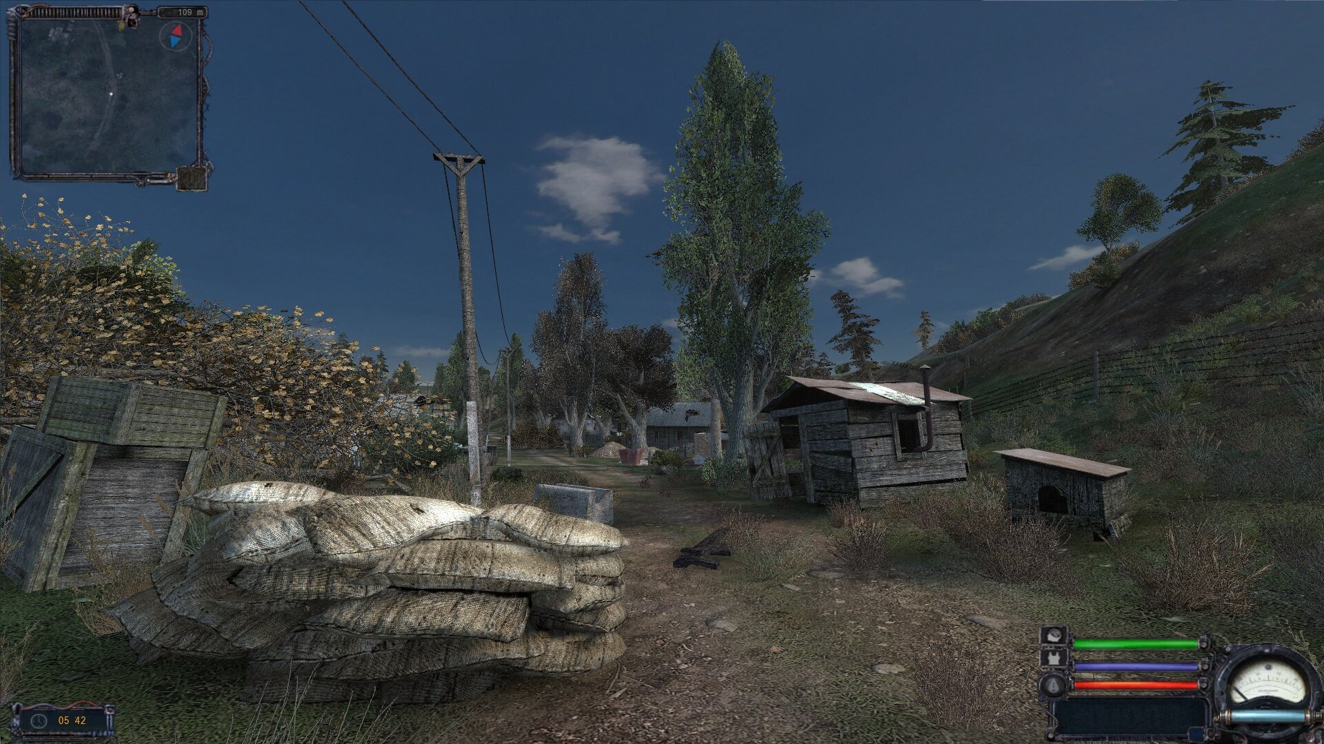 Chyba w skryptach jest ukryta opcja obowiązku spania. Obraz rozmył mi się już na Bagnach, na których długo się bawiłem bez snu. 3 godziny wystarczyły dla ostrego obrazu. Mnie trochę irytuje wygląd “kurtki” nowicjusza czy bandyty. Jej tekstura nie pasuje do nazwy. Mniej by raziła nazwa “okrycie”. Ale to jest drobiazg. Tym razem nasz GB z głodu nie umrze . Co skrzynia, to żarcia ogrom. Ale to jest realne. Jest placówka, to obstawa żreć musi.