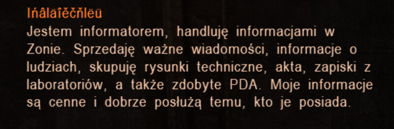 @Desolate Na tej wersji, którą pobrałeś od ruska zacząłeś grę całkowicie od nowa? Bo normalnie w modach do Cienia to ksywki GG czy ważnych postaci są zawarte w plikach character_desc_nazwa lokacji, które można znaleźć w config/gameplay, ale w tym modzie ksywki są brane z pliku stable_bio_name.xml z text/pol - spolszczenie nawet nie posiada folderu gameplay “w sobie”, więc to, że nie masz ksywek to według mnie efekt tego, że na tej wersji, którą pobrałeś z linków od tego ruska zamiast zacząć grę od nowa to próbowałeś kontynuować na swoich starych zapisach i stąd krzaczki zamiast ksywek - innego wytłumaczenia nie widzę.