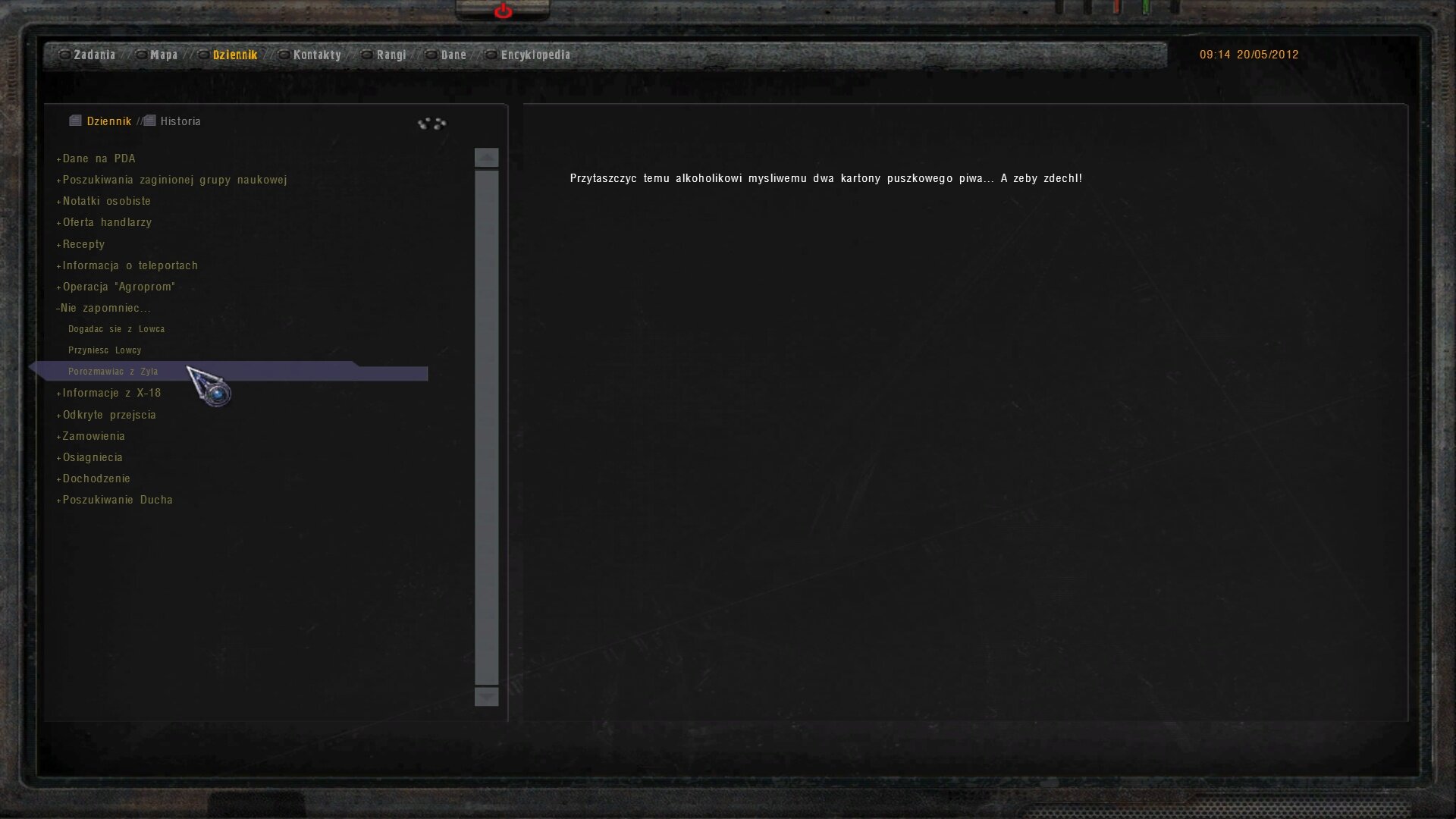 - temat piwa dla Mysliwego to składowa questu na PDA Krysiuka. Za piwo dostajesz “rodzinna pukawkę” którą oddajesz Żyle , a on w zamian poda Ci namiar na schowek z PDA Krysiuka - gdyz herr Krysiuk zszedł Twoimi rękami ( jak mniemam) z tego łez padołu . PDA oddajesz Borowowi - dostajesz nagrodę … i dalej do następnych przygód.