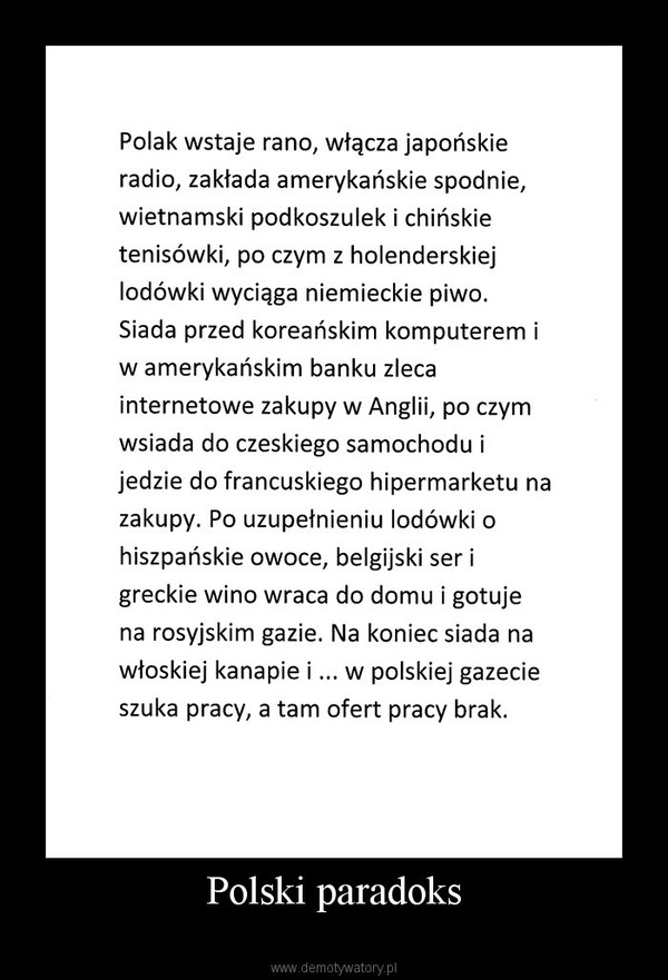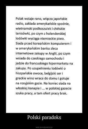 Zastanawiałeś się kiedyś dlaczego wszystkie duże sieci handlowe są w obcych rękach, a co za tym idzie kapitał wypływa z kraju. Nie wspomnę o dużych zwolnieniach podatkowych na starcie również na niekorzyść Polski. To właśnie znaczy że Polacy nie potrafią sami zadbać o swoje interesy i wolą je oddać innym by czerpali zyski. To właśnie jest nieporozumienie..obca spółka kosi kasę na polskich produktach, a powinno być inaczej. Może dla sprzedającego to tylko produkt, ale ten produkt powinien był pozostać w polskich rękach i dawać zyski do skarbu. A tak …sieci odprowadzają podatki i jest OK.