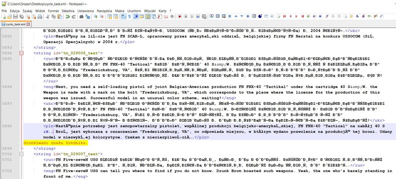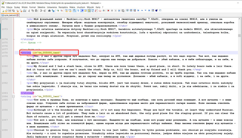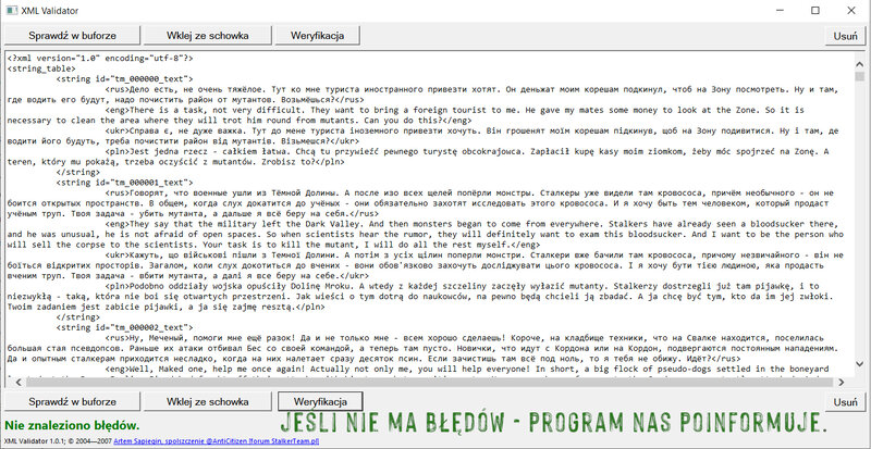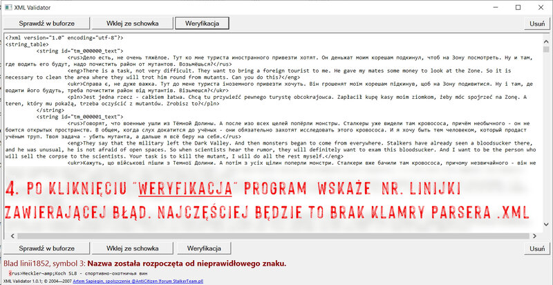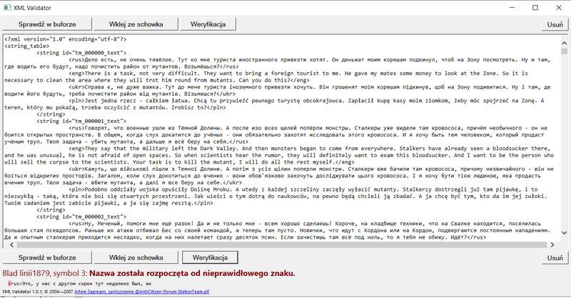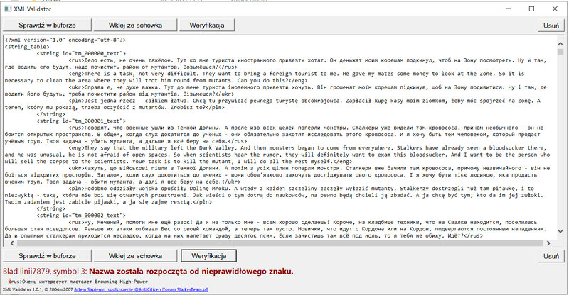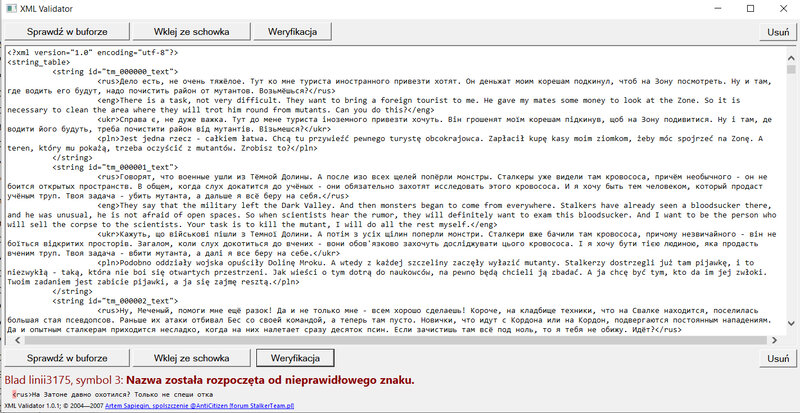 Opis: program sprawdza pliki .xml pod kątem błędów (spójności parsera .xml), innymi słowy - sprawdza czy nie brakuje klamry zamykającej w plikach, co często ma miejsce w pracy z dużą ilością tekstu. Brak takiej klamry i mamy gwarantowany CTD (jak powyżej w logu - patrz spojler).