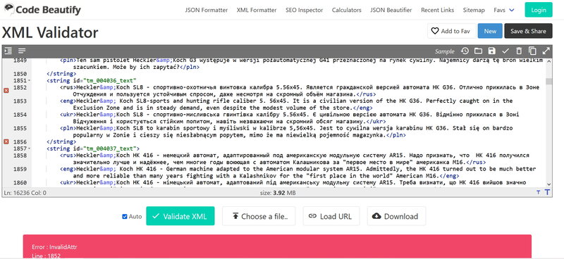 5. Otwieramy kopię pliku .xml i znajdujemy nr. linijki - poprawiając błąd. Jak widać poniżej - brakuje klamry w wierszu 1851, a to skutkuje błędem w parserze zawartym w wierszu 1852, co wykazał program.