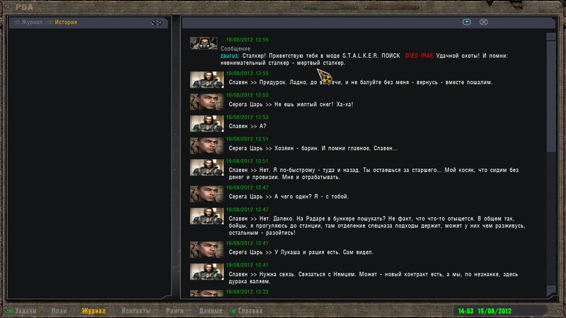 Na początek mamy powitanie od autora moda Zaurusa. Tłumaczenie: Stalkerze! Witam cię w modzie STALKER Poszukiwacze Dies Irae. Udanych łowów! I zapamiętaj: nieuważny stalker - martwy stalker. Sporo pograłem i z CEA dotarłem w ciężkich bojach aż na Kordon.