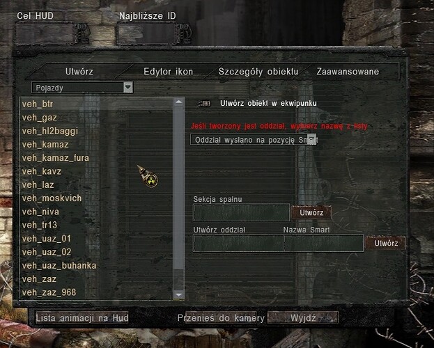 naciskasz w czasie gry ESC i S, a następnie wybierasz zakładkę pojazdy, ODZNACZASZ “Utwórz obiekt w ekwipunku” i klikasz dwa razy na nazwę pojazdu. Na czas spawnu pojazdu najlepiej użyć komend g_god on i g_god off, bo pojazd “spada” nam na głowę w czasie spawnu i od razu zabija.