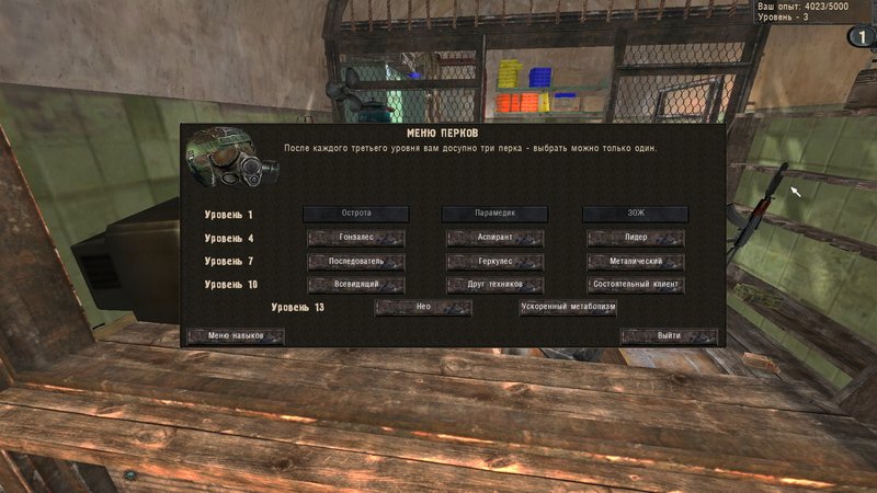 Mam już trzy umiejętności. Przetrwanie, Naprawę i Szabrownictwo. Tyle tylko, że wszystkie trzy wzięte w ciemno, bo mod nie daje żadnych podpowiedzi, co uzyskujemy wybierając tę, a nie inną umiejętność. No i te “perki”. Nie znam tego słowa i żaden słownik nie był mi w stanie tego przetłumaczyć.