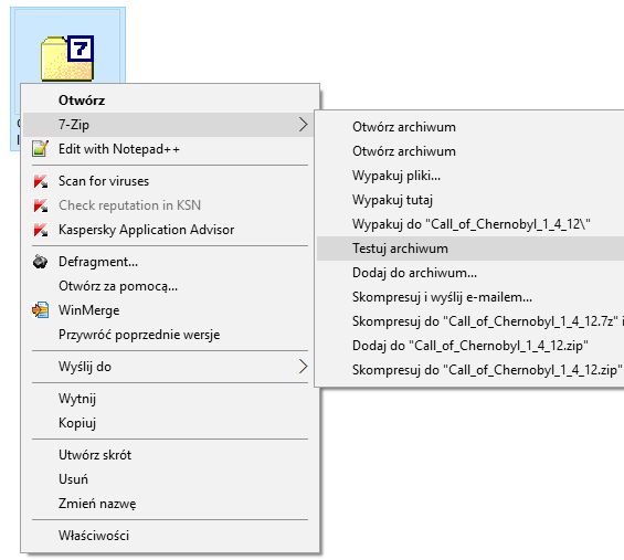 Naciśnij “Testuj archiwum” w menu kontekstowym 7-zipa, pojawiającym się po naciśnięciu prawego przycisku myszy na pliku archiwum.