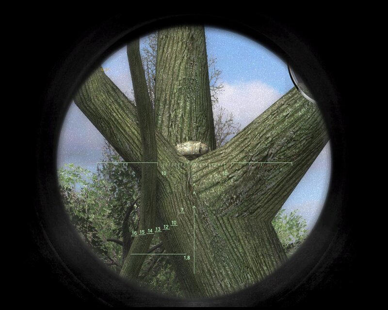 Schowek jest na dużym bezlistnym drzewie. Można przeskoczyć z dachu domu obok.