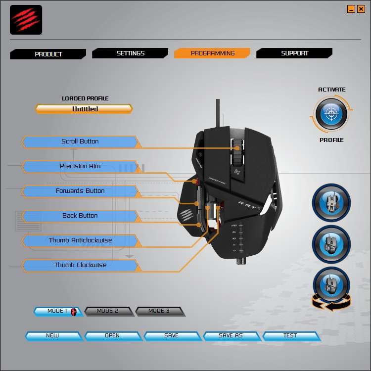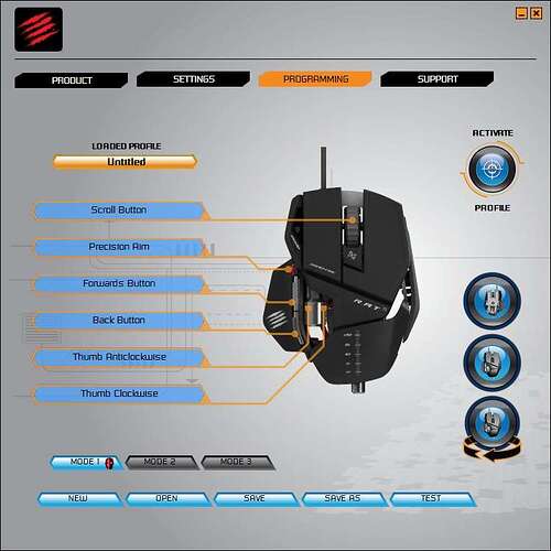 Szczur piąty daje nam możliwość zaprogramowania 6 dodatkowych przycisków (oprócz LPM i PPM) w trzech przełączanych trybach (mode) czyli dla każdego stworzonego przez nas profilu aplikacji (gry) można maksymalnie mieć 18 różnych makr (trzy przełączane tryby (mode) po 6 różnych makr w każdym). Każdy z trybów (mode) jest sygnalizowany innym kolorem diody na przycisku zmiany trybu. Zaprogramować można zarówno odtwarzanie kombinacji klawiszy z klawiatury jak i kliknięcia naszego szczura. Każde makro można zapętlić i na przykład przyciskiem włączać / wyłączać symulację wciśniętego i trzymanego Ctrl lub innego klawisza. Profile można zapisywać a szybki dostęp do nich zapewnia ikonka w pasku zadań.