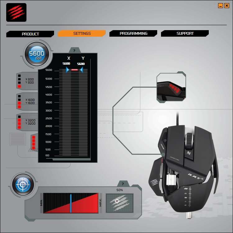R.A.T 5 Posiada cztery tryby czułości przełączane przyciskiem znajdującym się za kółkiem przewijania i sygnalizowane przez wskaźnik diodowy. Każdemu ustawieniu można przypisać dowolną czułość w zakresie 100dpi - 5600dpi. Standardowo są to kolejno 800, 1600, 3200 i 5600 dpi. Dodatkowym ficzerem jest przycisk “aiming” którego wciśnięcie powoduje chwilowe zmniejszenie dpi (o zaprogramowany wcześniej %) w celu np. lepszego celowania.