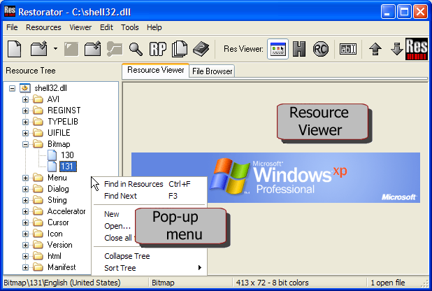 Restorator umożliwia edycję plików exe, dll, ocx, scr, itd. Narzędzie jest wykorzystywane do tworzenia tłumaczeń, zmiany wyglądu aplikacji.