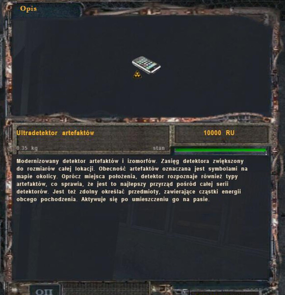 @kobal Mam bioradar uniwersalny (działa), detektor anomalii “holograma” (działa), i ultra detektor artefaktów ,który nie wykrywa artefaktów i tak nosze go przy pasie , lecz się nie uaktywnia…