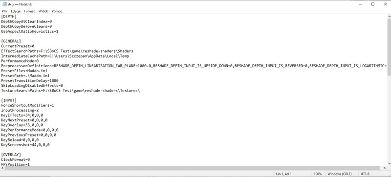 I teraz tak - wchodzimy do katalogu z modem, do folderu “game” i otwieramy notatnikiem plik dxgi.ini, w linijkach EffectSearchPatchs i TextureSearchPatchs wklejamy ścieżkę do naszego folderu “game” przed dopiskiem **\reshade-shaders\Shaders i reshade\shaders\Textures**, w moim przypadku ścieżka to F:\SBoCS Test\game i na koniec powinno to wyglądać mniej więcej tak (czasem po dopisku reshade-shaders\shaders mogą być jeszcze inne różne dziwne dopiski, więc kasujemy je tak, by ścieżka wyglądała tak, jak na zrzucie):