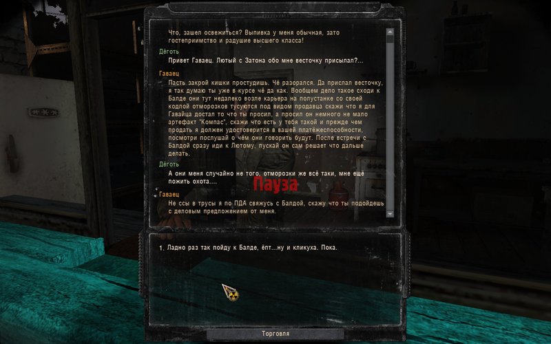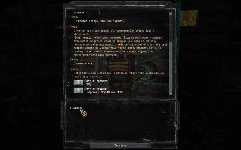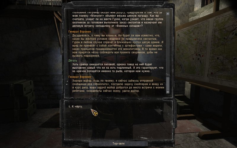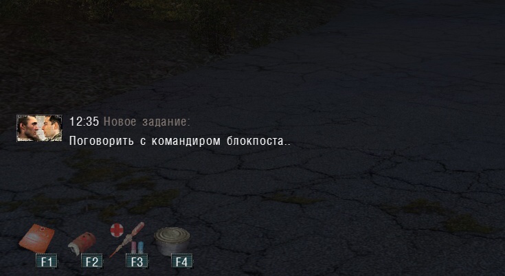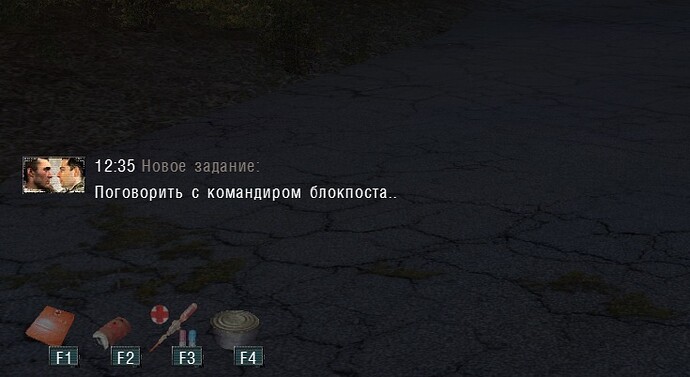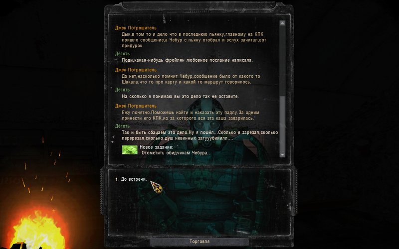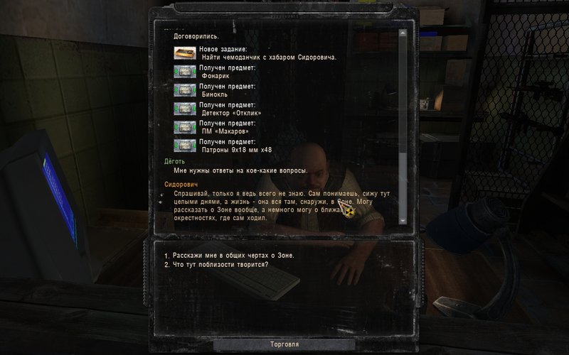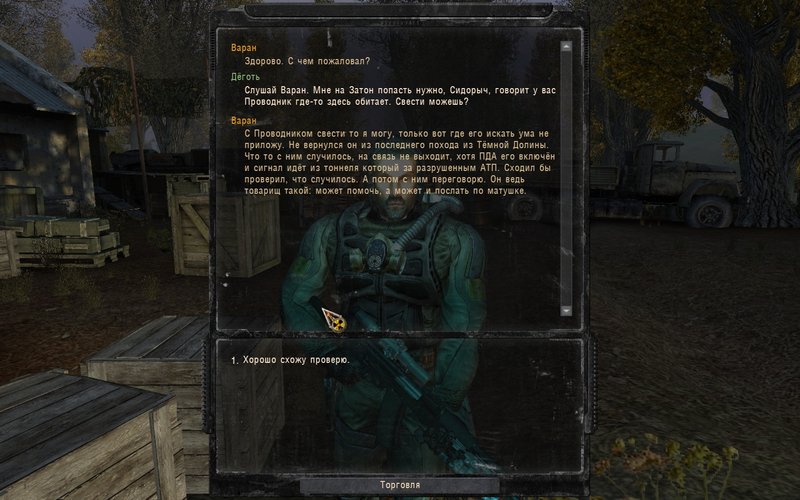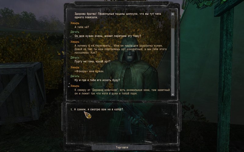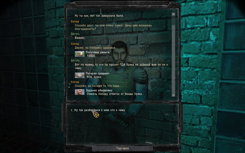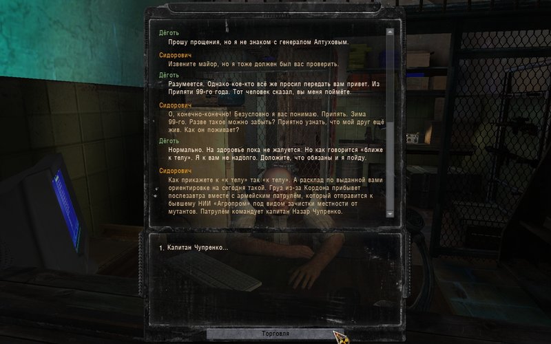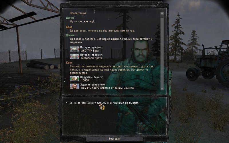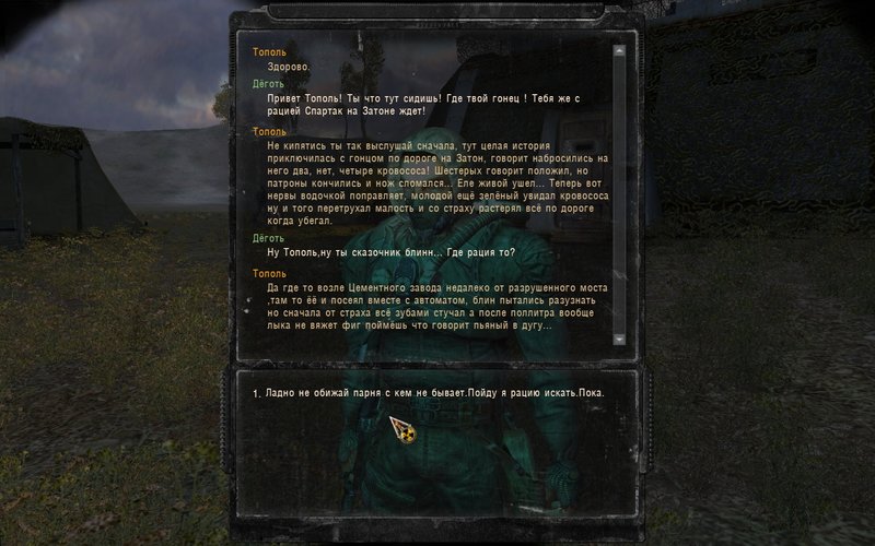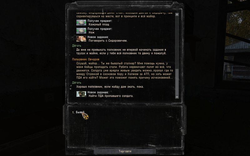 Grę zaczynamy na Kordonie. Mamy dowiedzieć się wszystkiego o kompleksie rakietowym Zamieć - D. Rozmawiamy z dowódcą wojskowego posterunku. Daje nam zadanie na odnalezienie PDA żołnierza w rejonie ATP - nasyp. Tam był ostatnio widziany. Mamy też pomówić z Sidorem. Ten karze nam odnaleźć swój towar. Walimy.