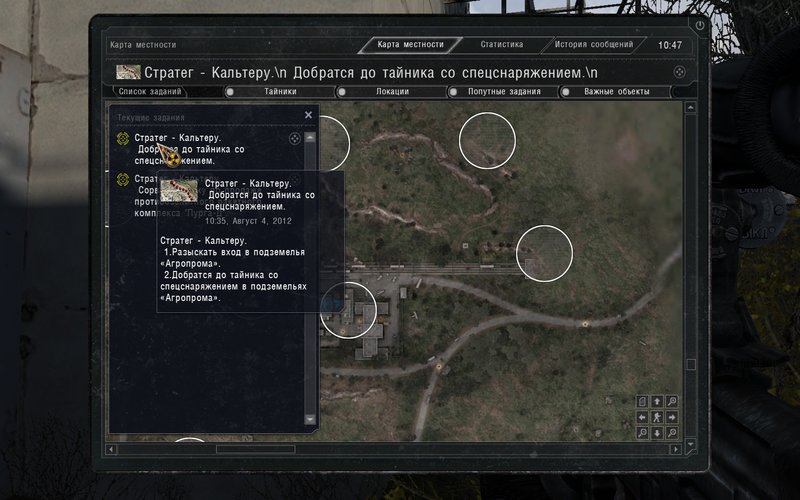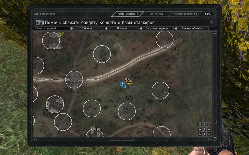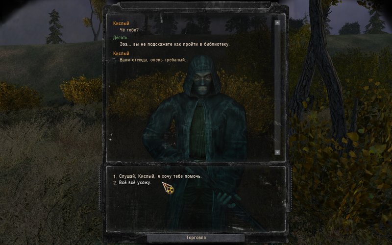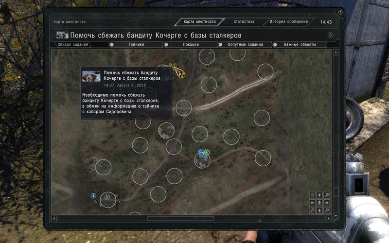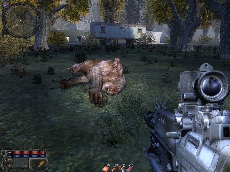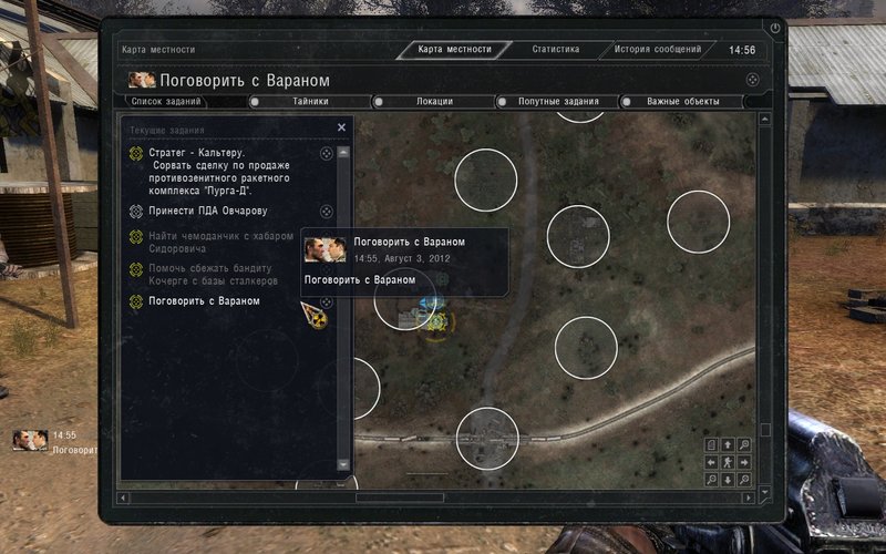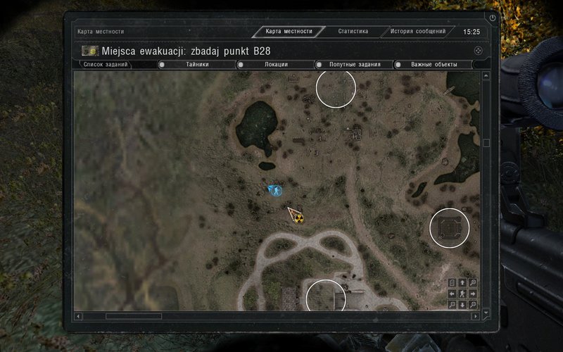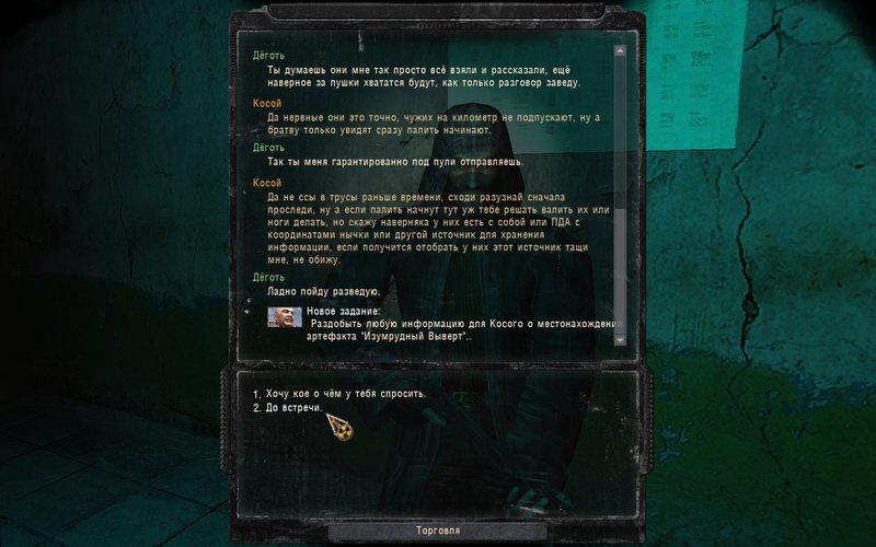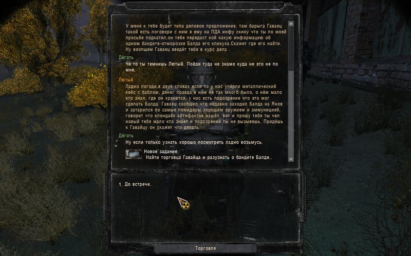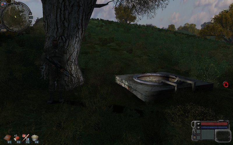 Po drodze do bazy szukamy PDA. Znajdujemy szkielet i PDA w krzakach. Bandyta w bazie stalkerów okazuje się mechanikiem. Rozmawiamy z ich przywódcą Waranem (stalkerów).
