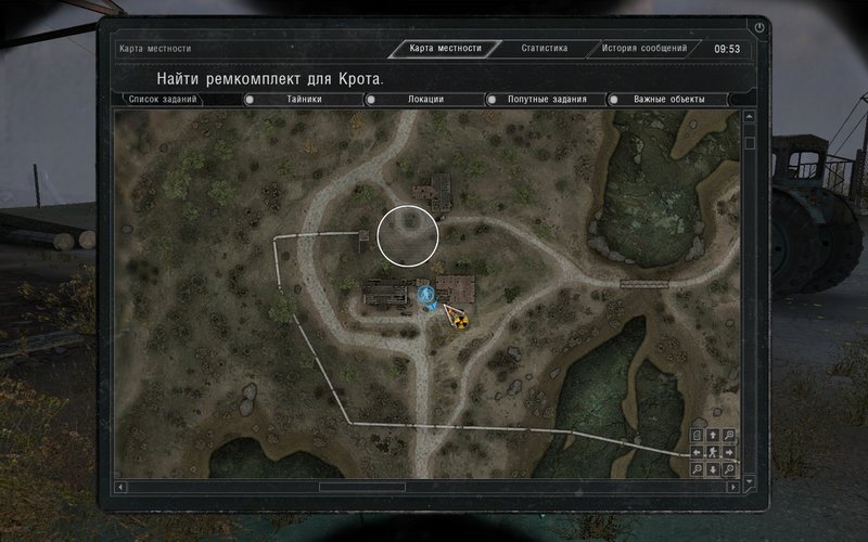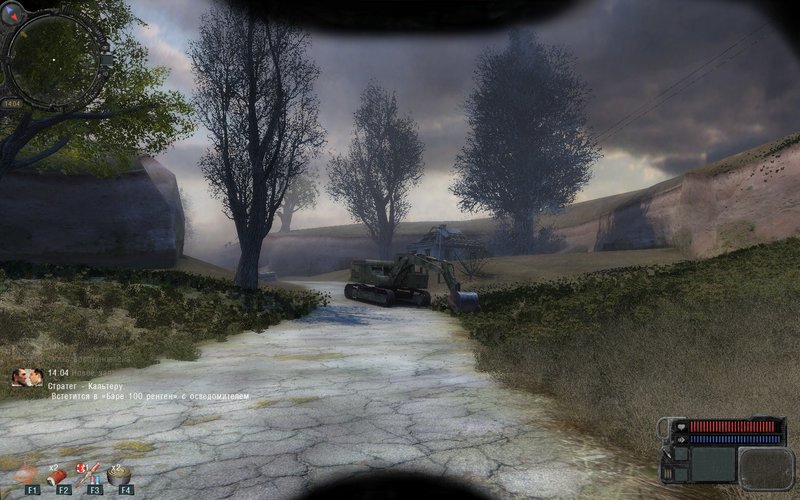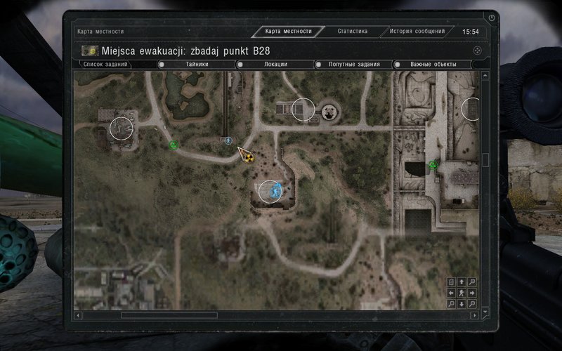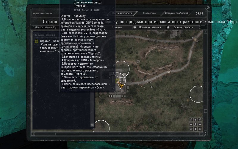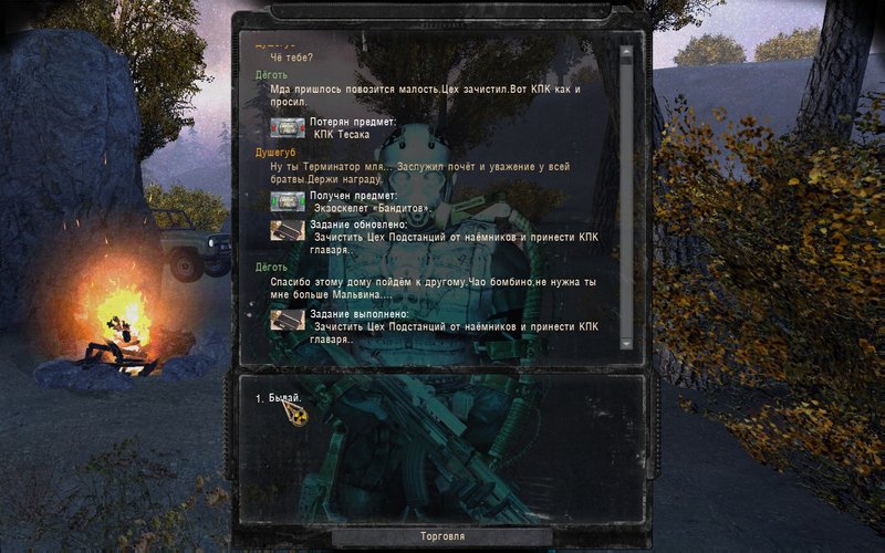 Wychodzimy w kompleksie i kasujemy wrogów - przynajmniej ja tak zrobiłem. Szukamy urządzenia w którym da się coś wymontować - BTR to fajne urządzonko - w momencie kiedy zaczniemy demontować kontener pojawia się śmigłowiec. Zabujamy obstawę helikoptera i patrzymy jak 2 kolesi coś kręci przy wozie pancernym. Potem grzecznie wsiadają do śmigłowca i odlatują. Czekamy aż znikną - inaczej będą nas ostrzeliwać z powietrza. Wymontowujemy płytki - czekamy aż po najechaniu na kontener będą widoczne - zabieramy je i idziemy na Wysypisko. Tam dostajemy zadanie na Bar 100 rentgenów. Ruszamy. Na Wysypisku jet baza - tam mechanik i handlowiec - możemy też odpocząć.
