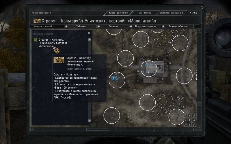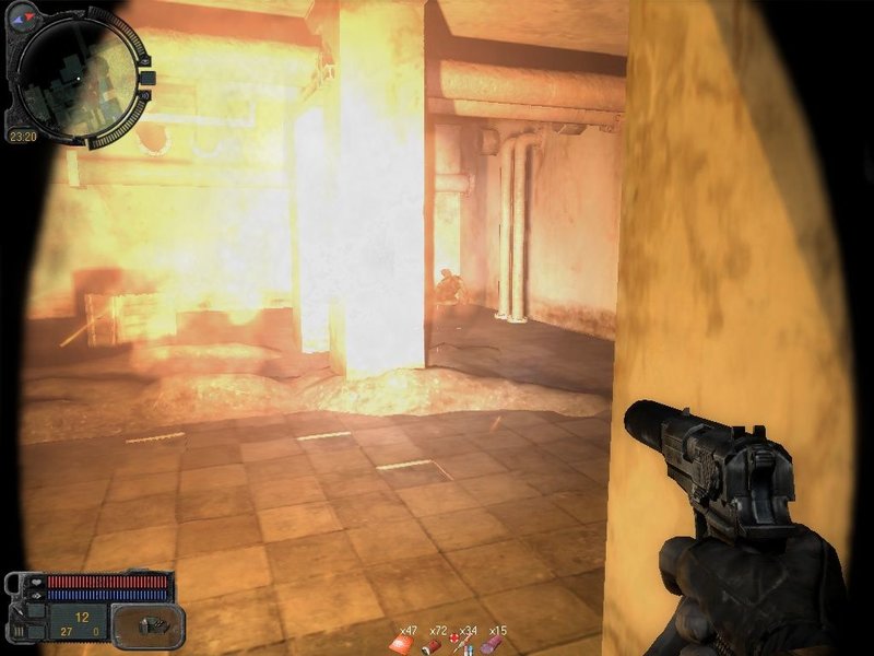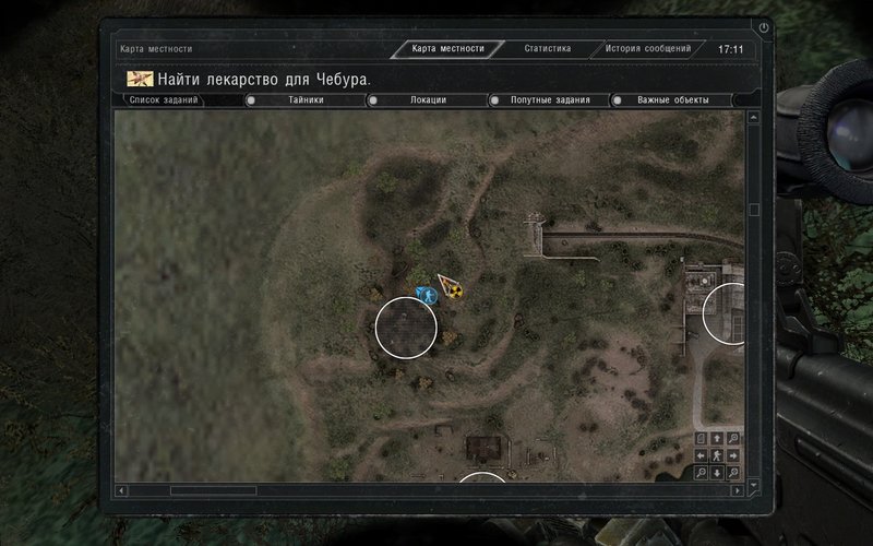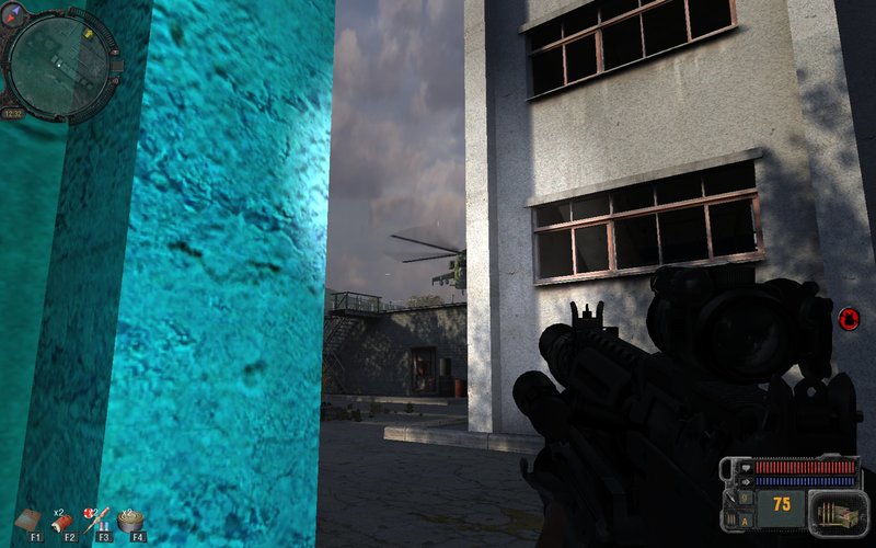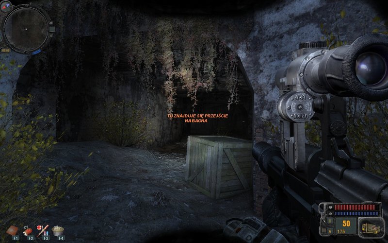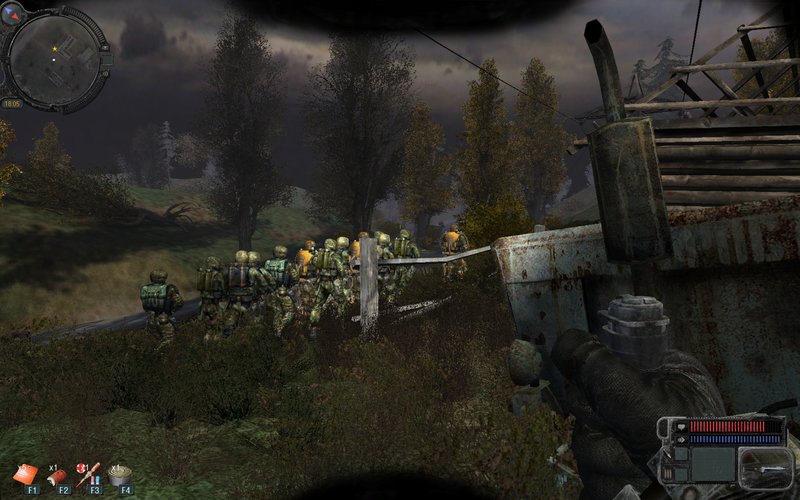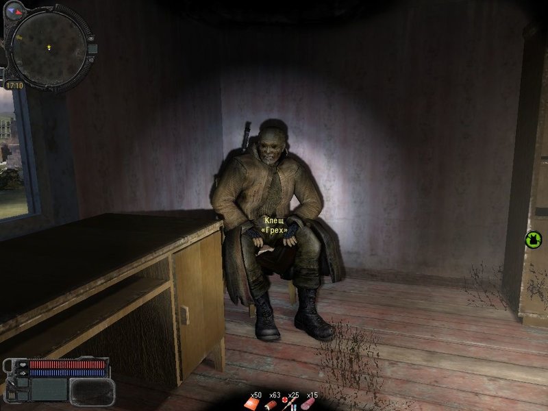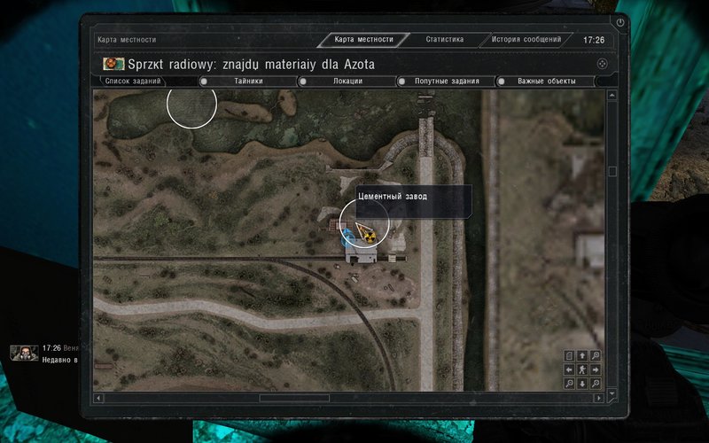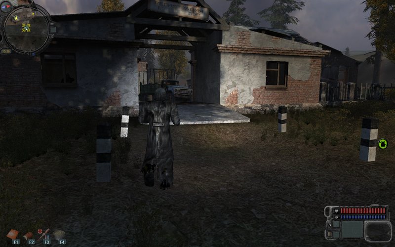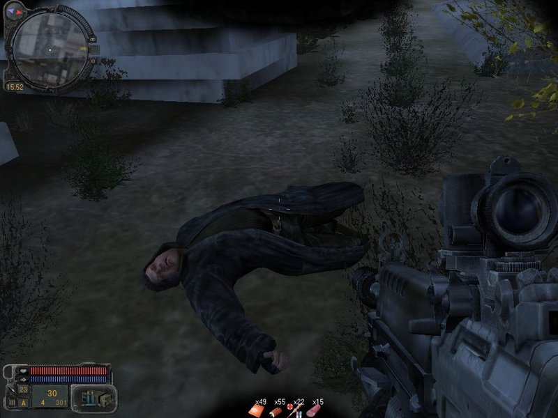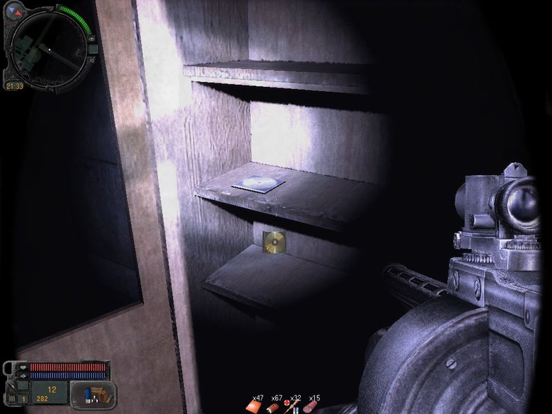 Rozmawiamy z najemnikami na 2 piętrze budynku (wcześniej “czyścimy” lokację). Chowamy się za ściankę jak na screenie poniżej i czekamy. Przychodzi 5 Monolitowców - walimy ich - między nimi nie ma Gurona. Idziemy na Magazyny Wojskowe (przejścia pomiędzy lokacjami są tam gdzie w podstawce tylko ich nie widać). Tu dostajemy namiar na schowek w Wiosce Pijawek - mina z timerem. Czyścimy bazę wolności - Gurona wykańczamy sami - wyłazi z nory ;D. Podkładamy minę na helikopterze - podchodzimY od przodu maszyny i naciskamy klawisz “F”. Odchodzimy na bezpieczną odległość - następuje wybuch. W Barze nie ma już nic do roboty - nagrodą za ubicie Gurona były informacje o śmigłowcu, więc zasuwamy na Kordon do przewodnika - czas na Zaton. Radar wygląda pięknie :).