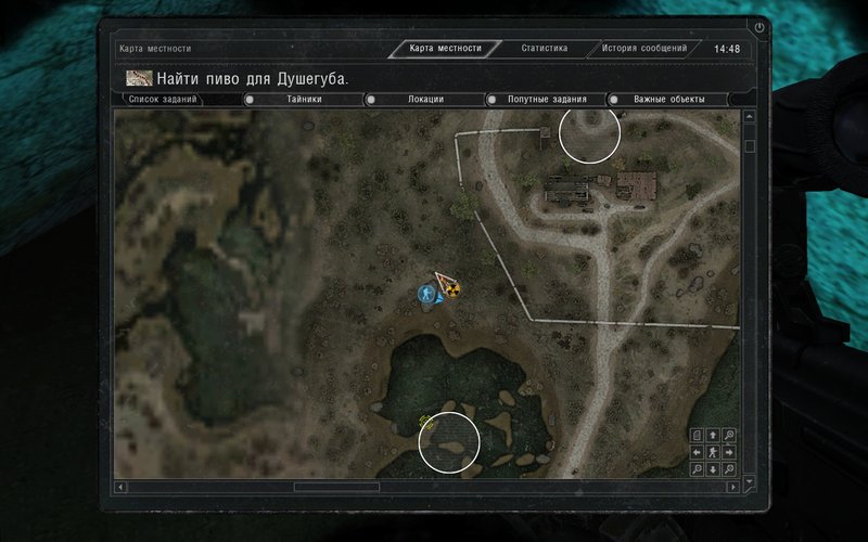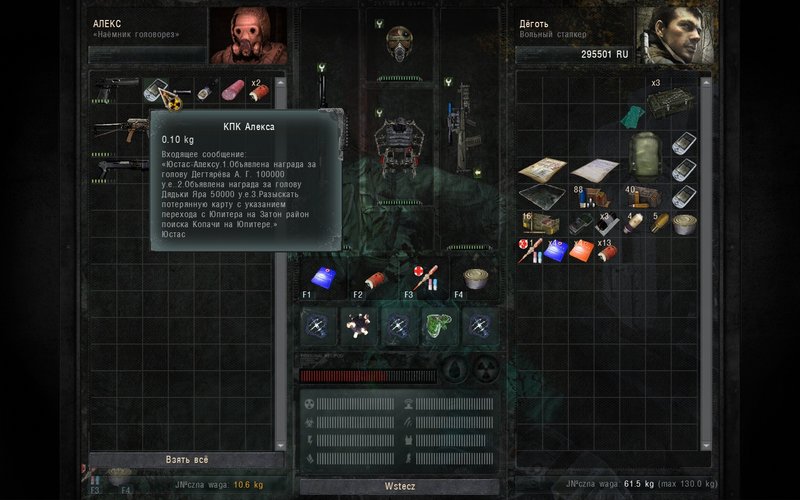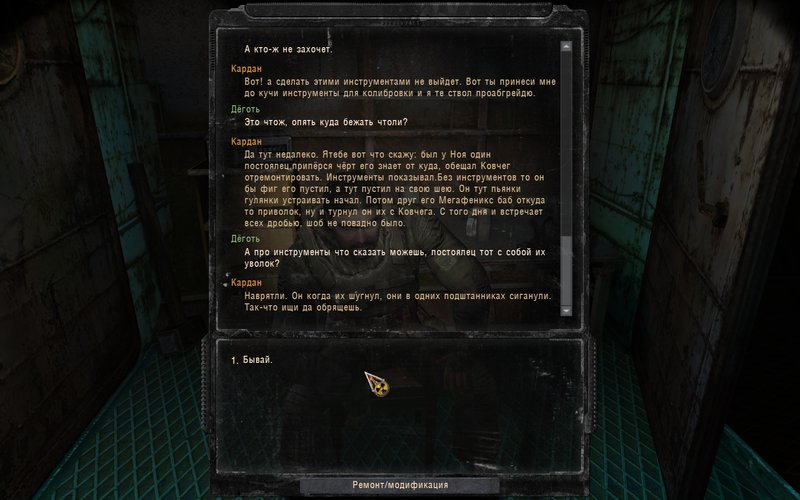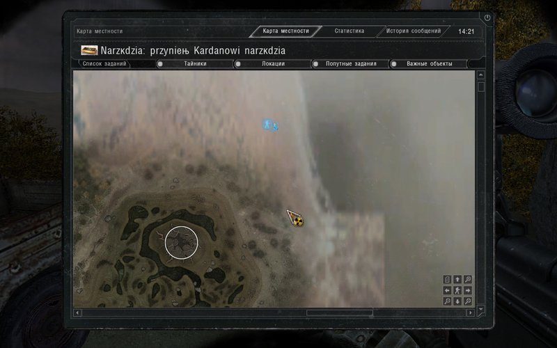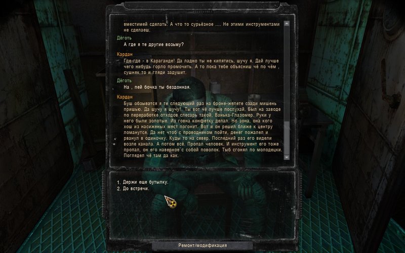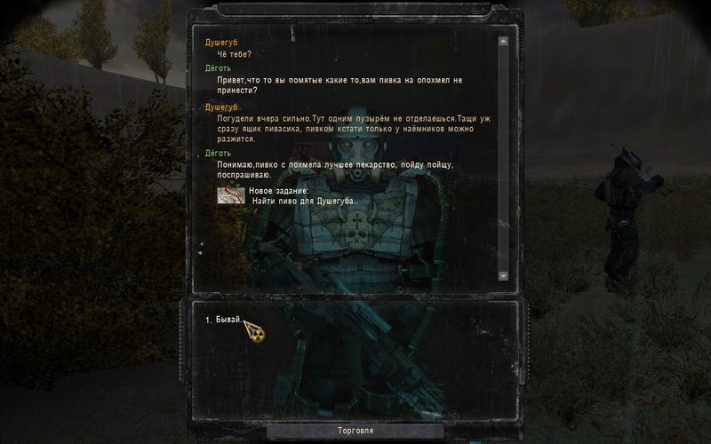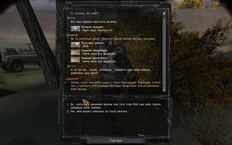 Na Zatonie oprócz zadań podstawowego wątku “ZP” są osoby które dają nowe wątki do przechodzenia. Pierwszy jakiego udało mi się napotkać to Duszegub. Mamy dla niego znaleźć piwo u najemników. Po drodze szukamy w kamieniach narzędzi Kardanowi. Przy okazji znalazłem przejście na Jupiter. Mamy Piwo i wracamy do zleceniodawcy. Ten daje nam kolejne na PDA najemnika na Podstacji. Rozliczamy się z Kardanem i Sową - laptop. Mechanik daje podpowiedź gdzie szukać narzędzi - na północy koło kanału. Ruszamy.