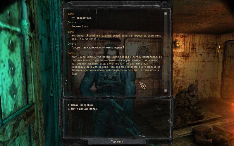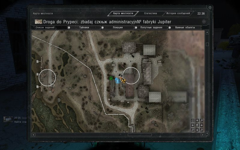 W Leśniczówce spotykamy Srogiego - pojawi się jeżeli sprzedamy PDA Morgana Sowie. Daje nam zlecenie na odzyskanie towaru. Mamy porozmawiać z handlarzem na stacji Janów. Na stacji zamierzania Krąg spotykamy Kosego - pojawia się on dopiero po zadaniu na likwidację gniazda pijawek. Ten daje nam zadanie na rozbicie bandy koło kompleksu Wołkow na Jupiterze. W pomieszczeniu obok na regale znajdujemy mapę przejścia Zaton - Jupiter - wcześniej jej nie było - szperałem po kompleksie przed zadaniem na pijawy (przejście znalazłem przypadkiem wcześniej -pisałem wyżej o tym). Na Szewczence spotykamy Wilka - prosi nas o przyniesienie dynamitu z Wołkowa. Po przybyciu na Janów rozmawiamy z handlarzem - ten odsyła nas na podstację kolejową. Tam spotykamy Wałda. Niestety to oszukaniec i zabijamy go. Zabieramy PDA -mamy je zanieść do Srogiego.