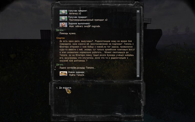 Faktycznie narzędzia zgodnie z podpowiedzią Kardana były na Arce na górnym pokładzie. Po akcji na Szewczenko po stronie stalkerów dostajemy od Spartana zadanie na odnalezienie Topola i radiostacji na Jupiterze.