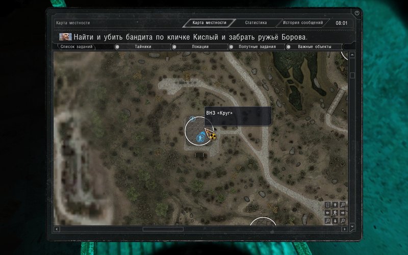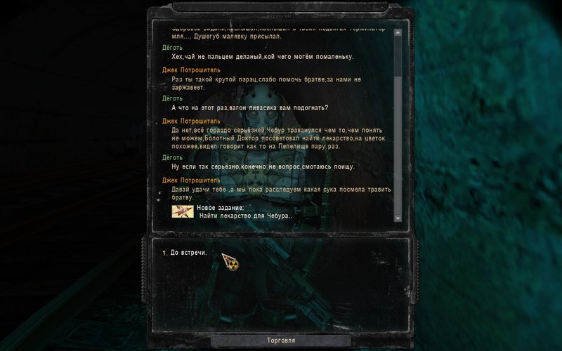 Odnajdujemy Kisla - zabijamy i zabieramy Toza dla zleceniodawcy. Spotykamy Dżeka Patroszyciela. daje nam zadanie na lekarstwo gdzieś w okolicy anomalii kocioł (za Kopaczi na cmentarzu są takie). Koło fabryki Jupiter w znznym nam z podstawki pomieszczeniu gdzie były narzędzia w szafie odnajdujemy rem-komplet dla Kreta. Na cmentarzu zabieramy roślinę i wracamy do Dżeka. Ten daje nam kolejne zadanie na odzyskanie PDA.