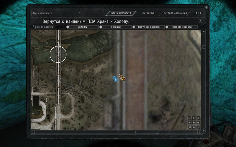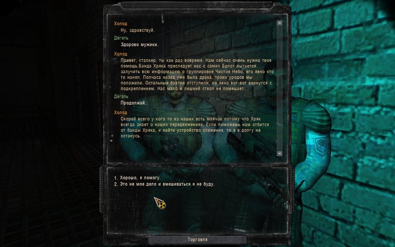 Idziemy na podstację i walimy Tasaka - zabieramy jego PDA. Będąc w pobliżu Stacji Oczyszczania, szukając narzędzi nad kanałem spotykamy Zimnego z Czystego Nieba z jego grupą. Dostajemy zadanie na unieszkodliwienia Chriaka. Ubijamy bandytów którzy prześladują naszych pracodawców już od Bagien. Oddajemy Zimnemu PDA Chriaka - i bierzemy zadanie na odnalezienie plecaków z amunicją nieopodal strąconego śmigłowca. Zimny rozszyfruje do tego czasu dane z PDA. Narzędzia faktycznie są nad kanałem obok kamieni.