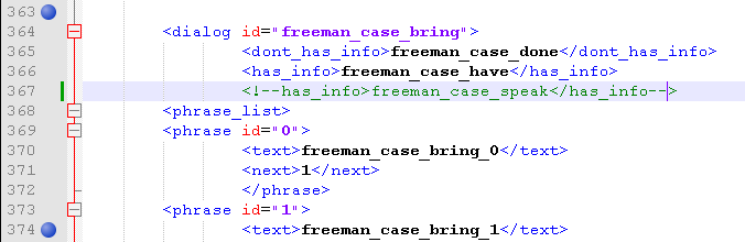 - To info powinno wpaść automatycznie przy pojawieniu się walizki Freemana/Jamesa w plecaku - nie byłbym taki pewny, czy walizka ze spawnera tu działa, więc też zakomentuj tę linię, znaki <!— to początek, a znaki –> to koniec komentarza, więc: <!–has_info>freeman_case_have</has_info–> w tej linii.