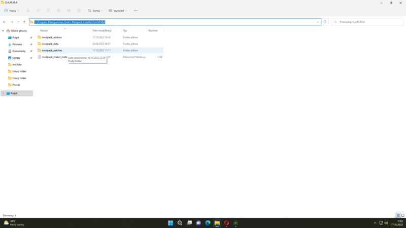 Jak ktoś nie doszedł do końca filmiku i nie wie czemu gra się nie uruchamia mimo, że wykonał instrukcję, możecie spróbować przerzucić pliki z folderu poniżej czyli modpack_patches (ścieżka poniżej na screenie), oczywiście to musicie wykonać po zamknięciu mod organizera (czyli tego czym uruchamiamy grę, ta ikonka “G.A.M.M.A.” z pulpitu) i możecie spróbować uruchomić, powinno wszystko działać wtedy
