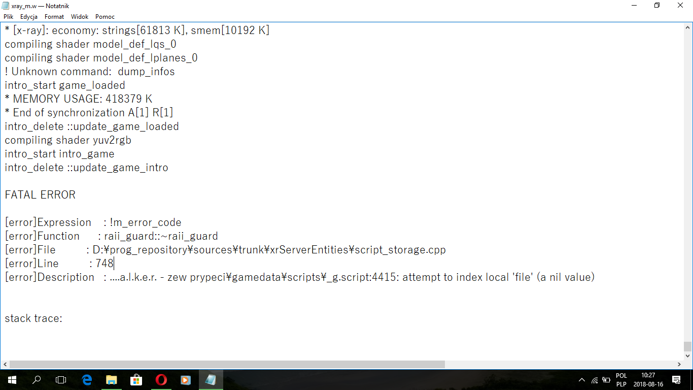 Zachciało mi się ostatnio pograć trochę w Stalkera, oczywiście z modami. Niestety po próbie zapisu gry, gra wyrzuca mnie do pulpitu z powiadomieniem “Xray 1.6 przestał działać” . Nie mam pojęcia dlaczego, pomocy ! Zamieszczam loga.